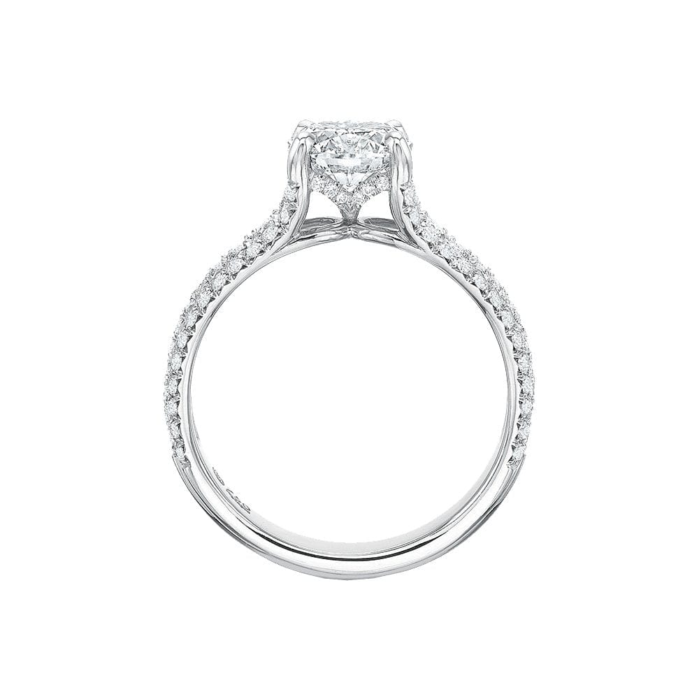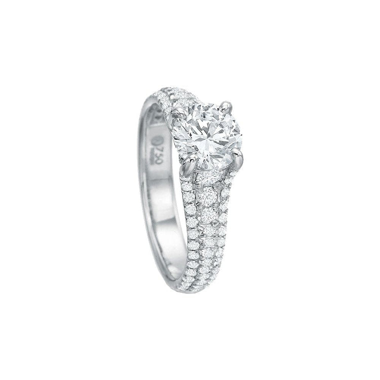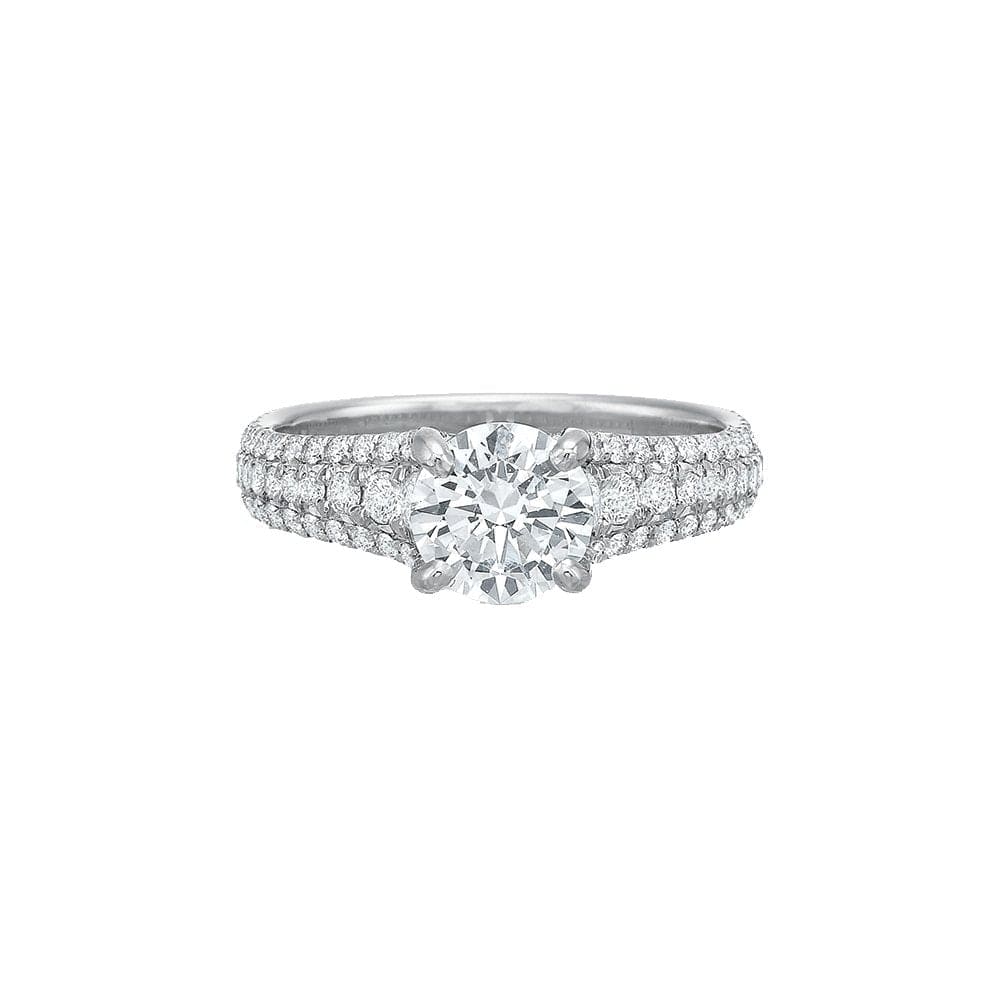 18k white gold 106=0.60ct h si1 br diamond extra petite semi mount ring, 4 prong rd cz center, 3 row cathedral shank, prong set, larger diamonds in center row