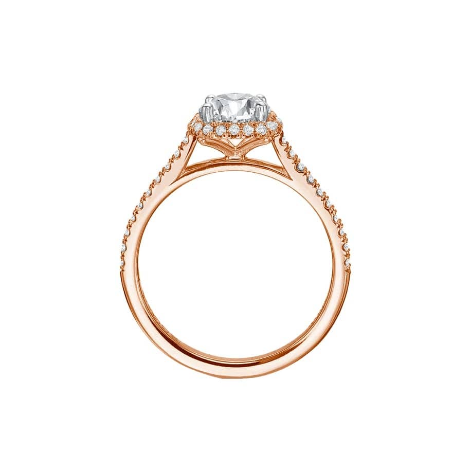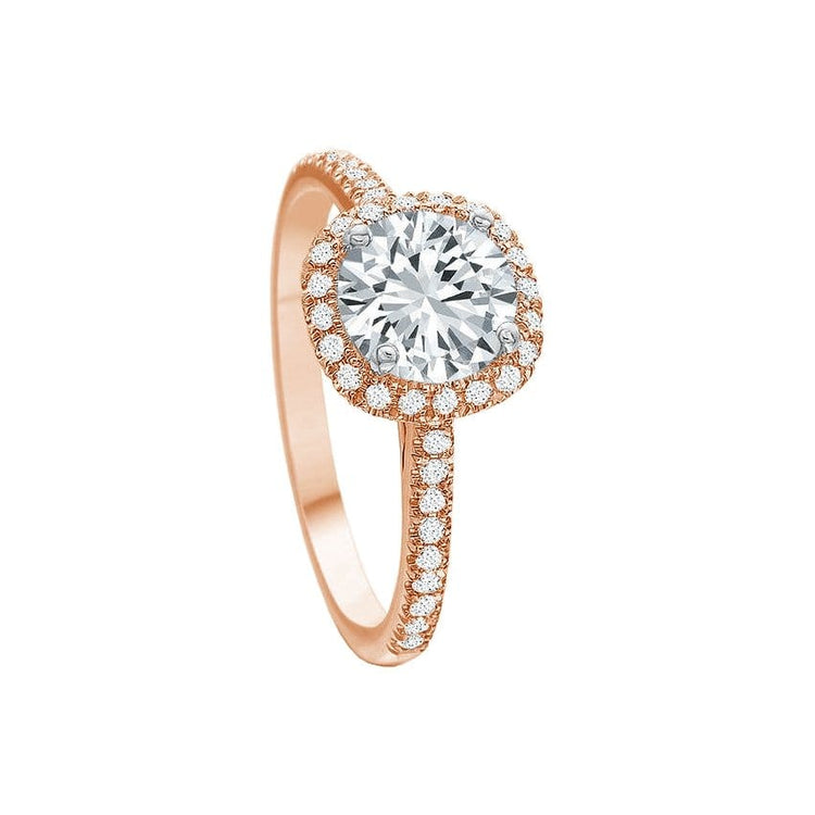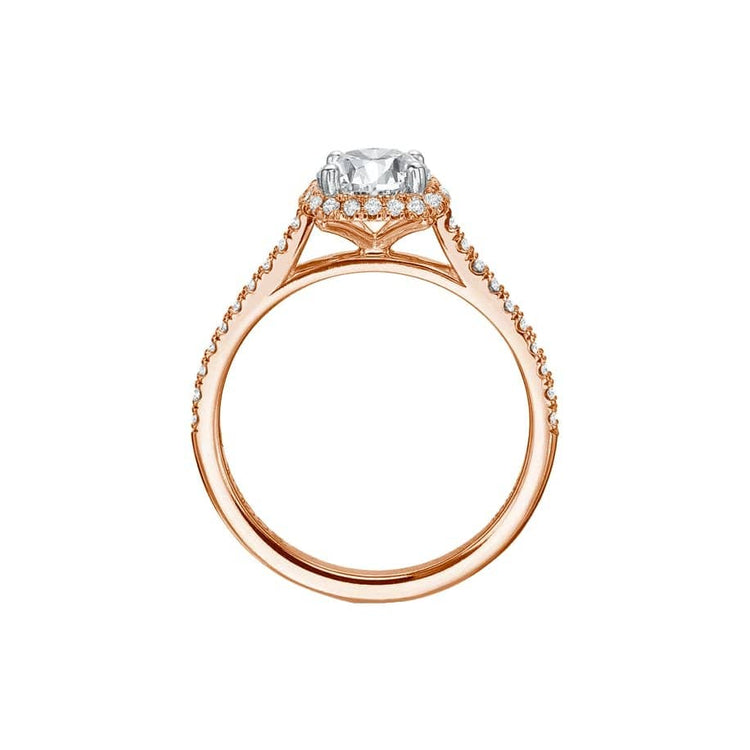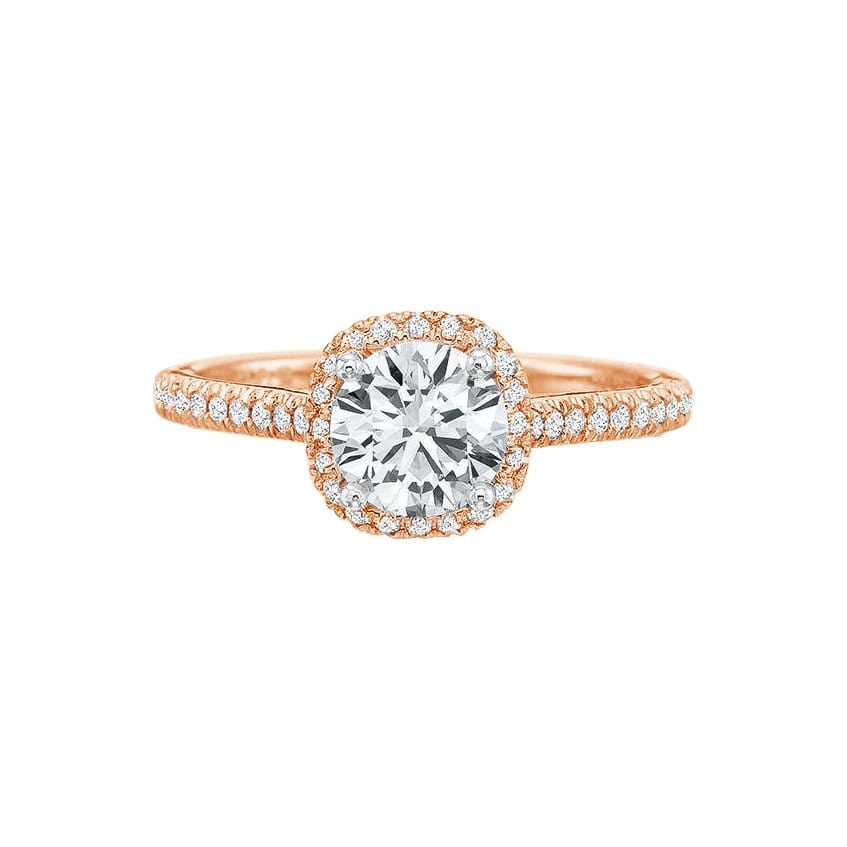 Precision Set's New Aire Petite Cushion Halo Semi Mount Ring is crafted from 18k rose gold with white gold prong accents. The center stone is accentuated with a cushion shaped halo set with round brilliant diamonds.