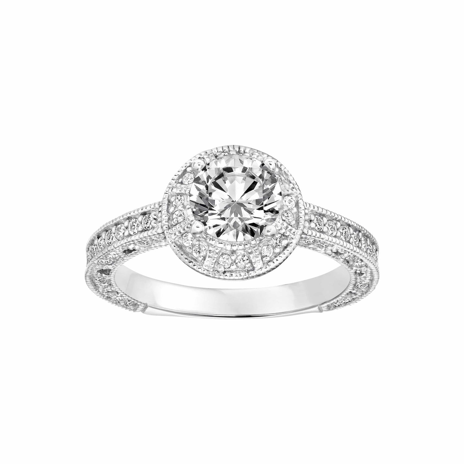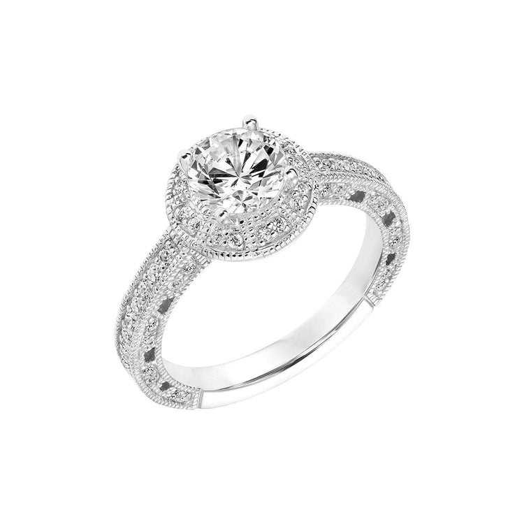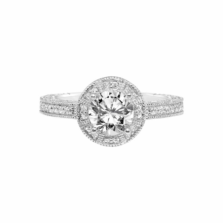 This lovely semi mount ring is crafted from 14k white gold and features an elegant diamond halo with round brilliant diamonds set alone three sides of the shank. A rope-like trim completes the look.