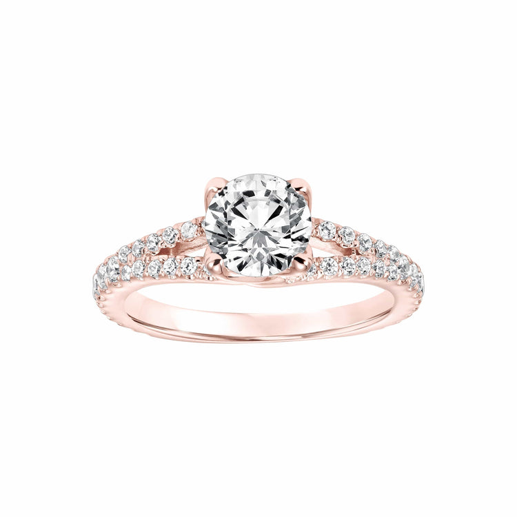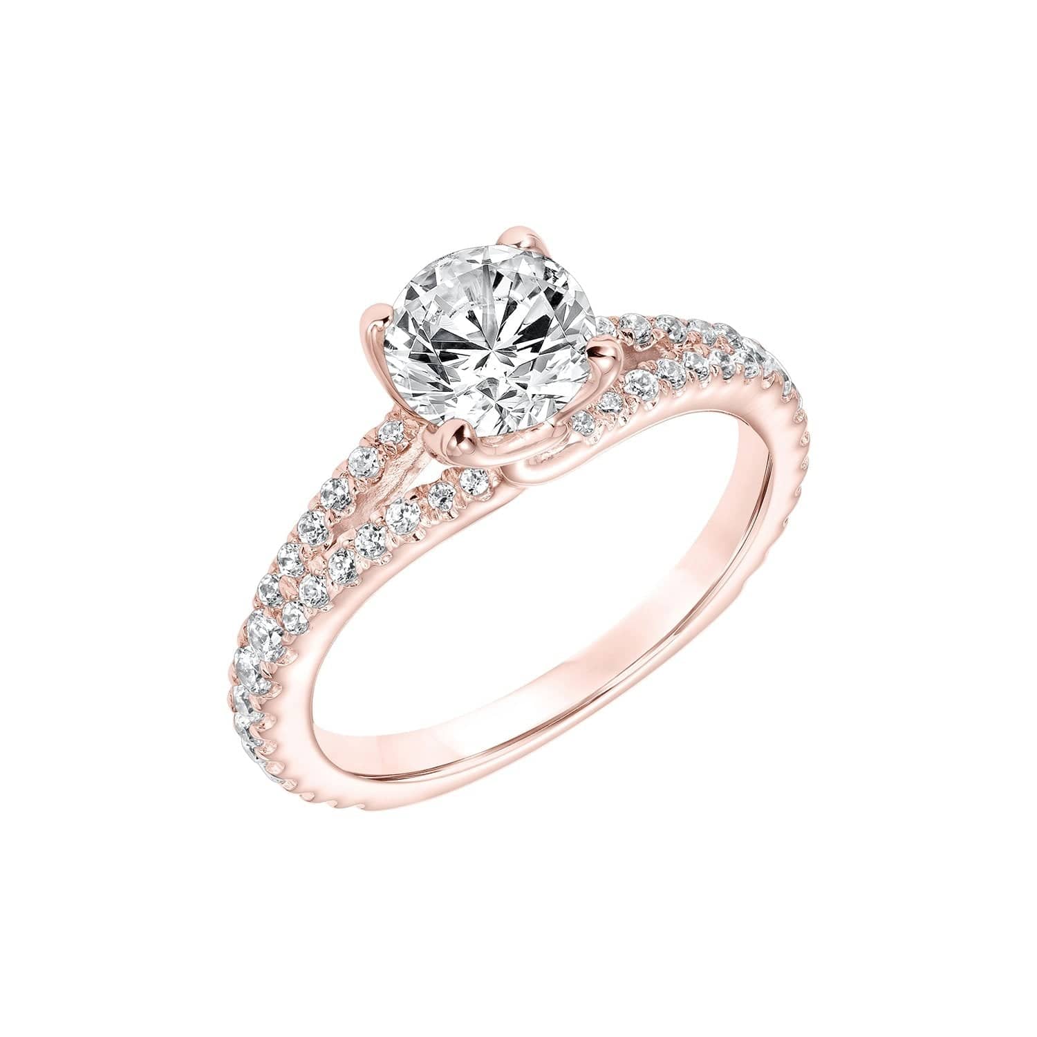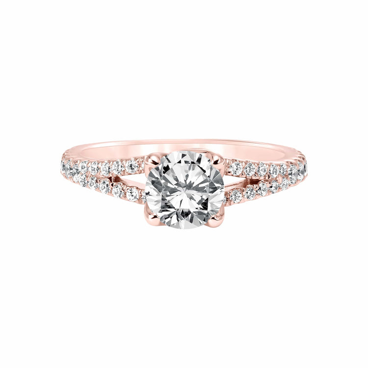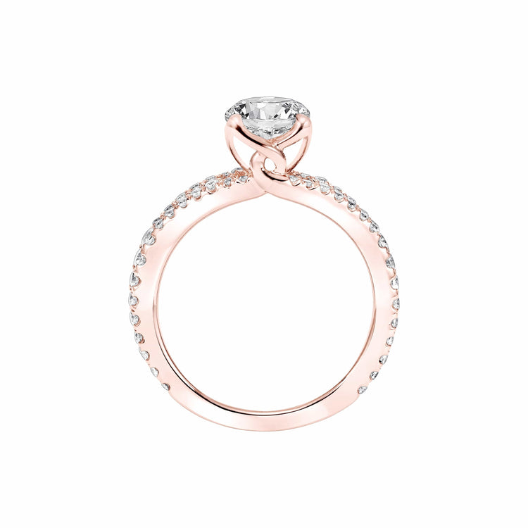 This beautiful diamond semi mount ring is crafted from 14k rose gold with an artful twist in the gallery and diamonds set in the split shank.