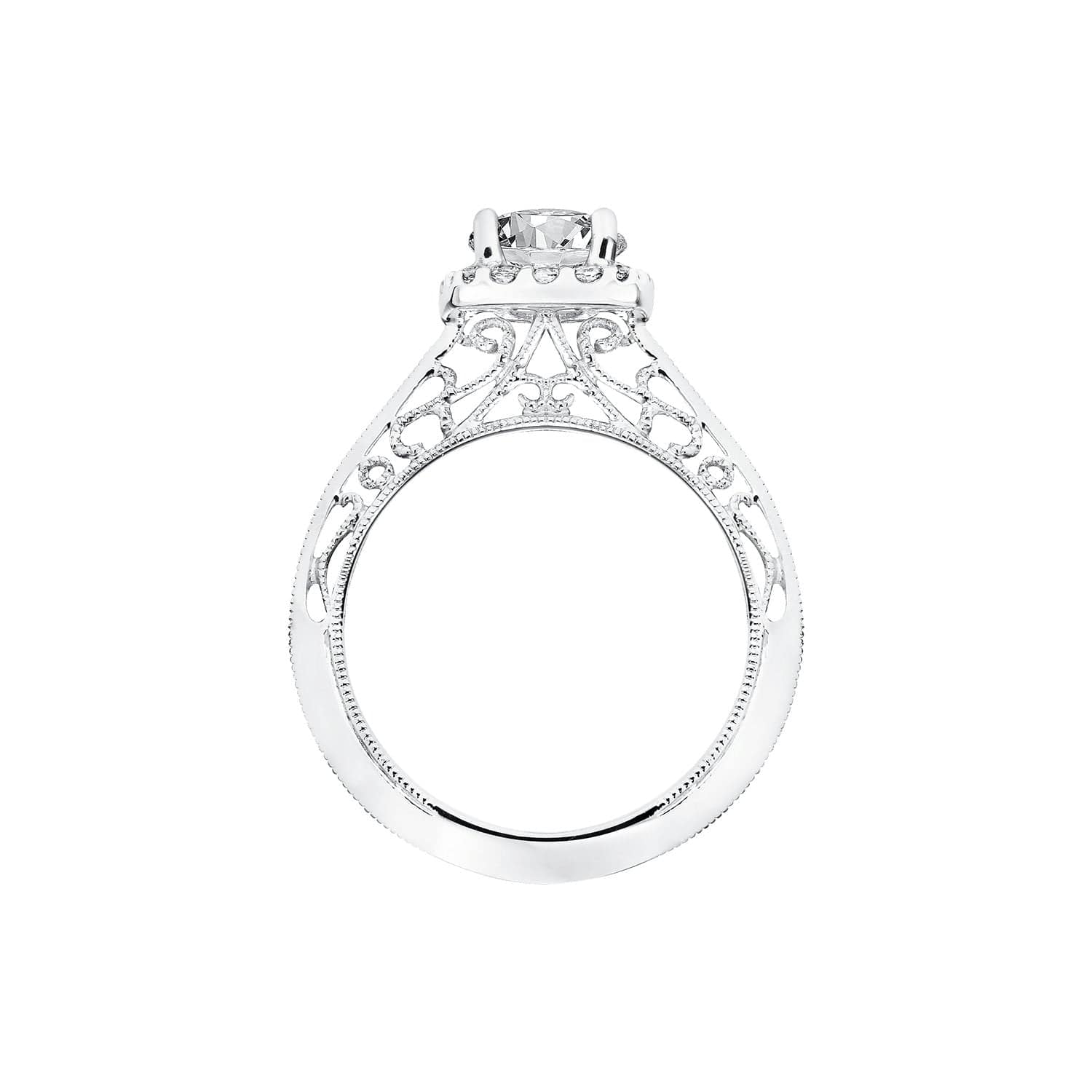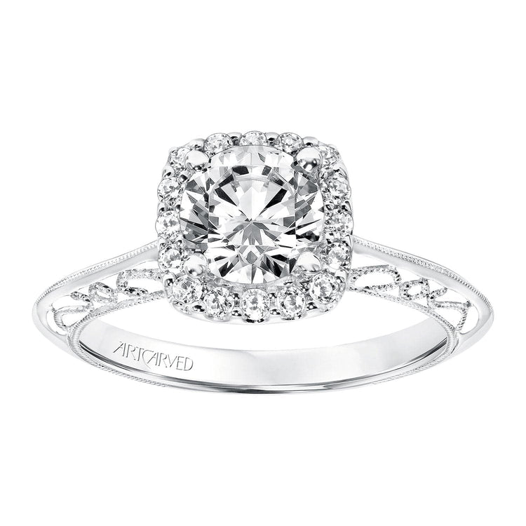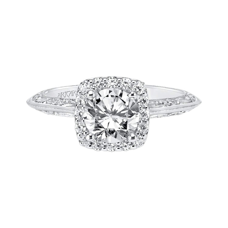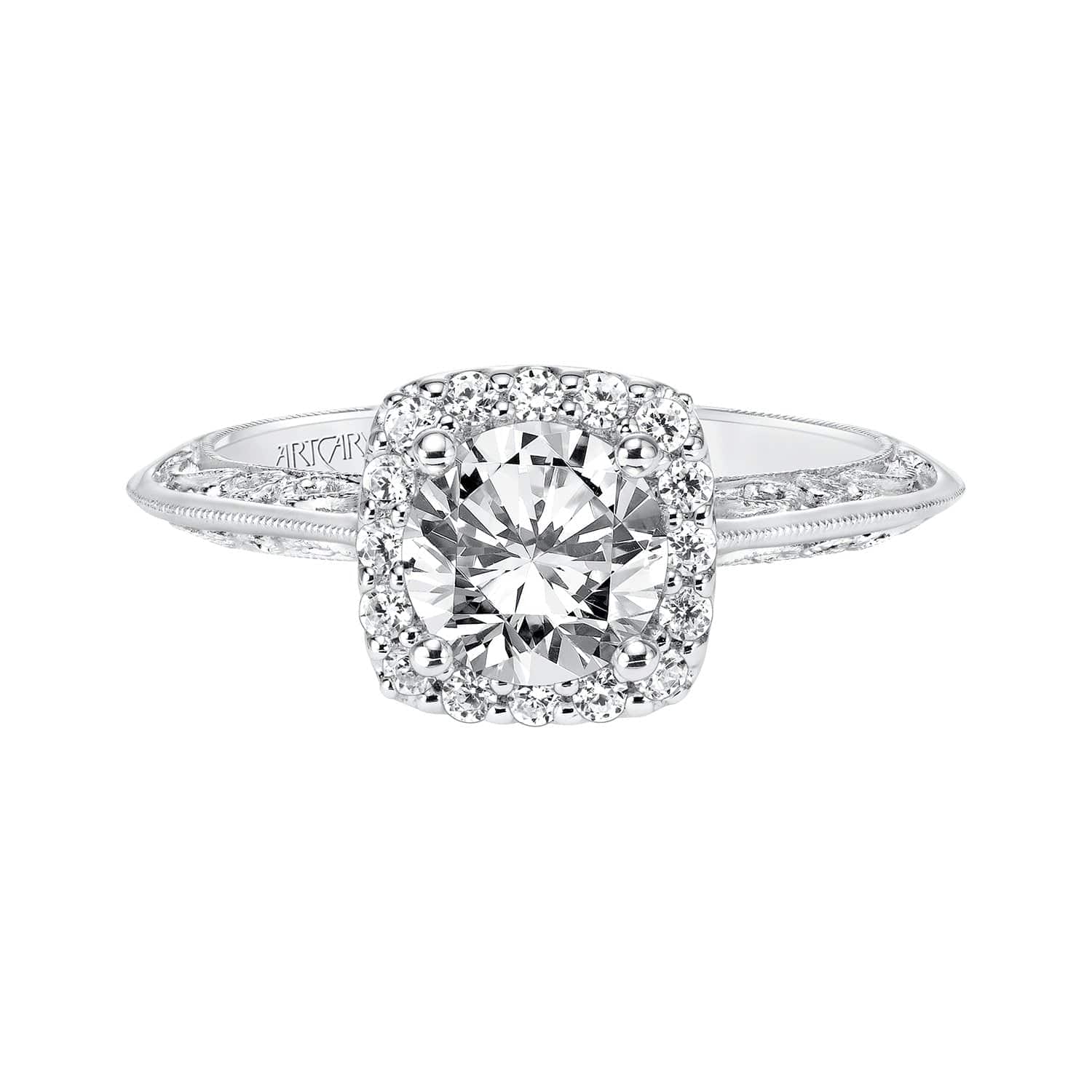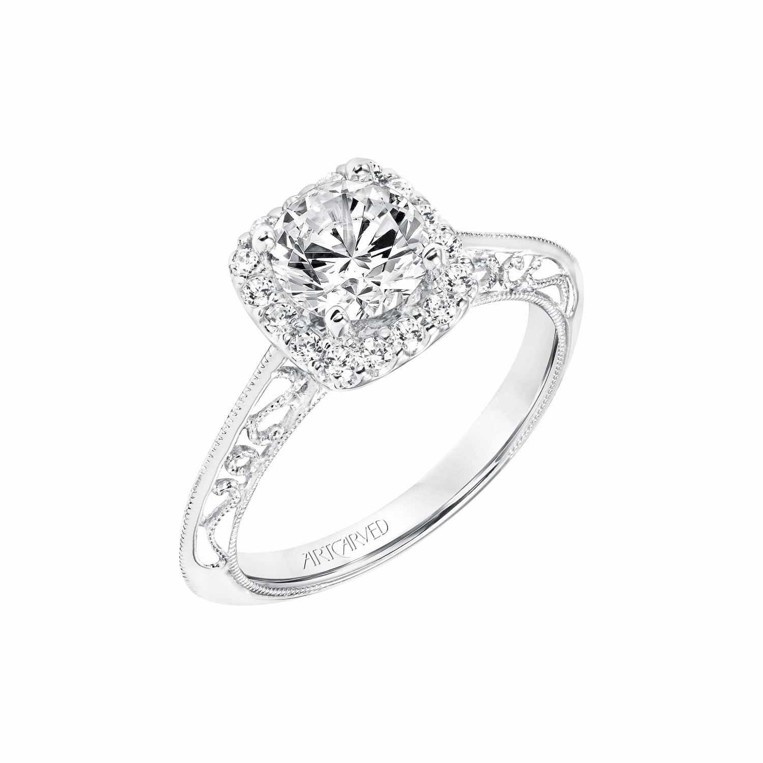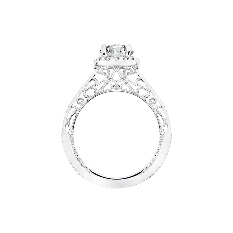 Artcarved's Audriana Semi Mount Ring has a vintage look with it's cushion shaped halo, knife edge shank with filigree scrollwork, and hand milgrain detail.