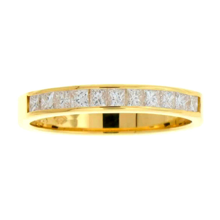 Celebrate your love with this timeless band. Its princess cut diamonds in a channel setting make for a classic and dignified wedding band that will symbolize your commitment. Perfect for those who want to add a touch of sparkle to their special day!