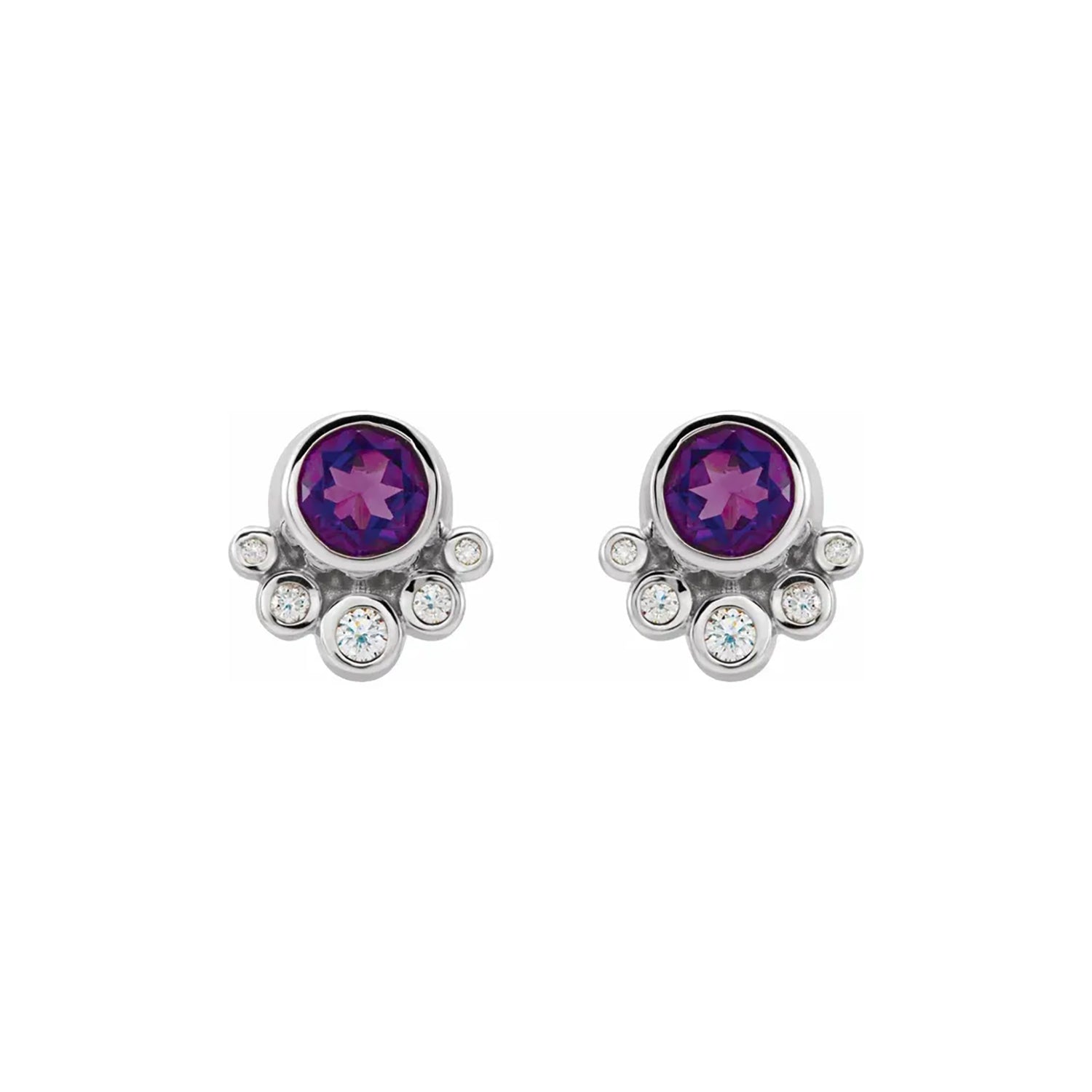 Indulge in the unique beauty of these Amethyst & Diamond Bezel Stud Earrings! Made with 14k white gold, these earrings showcase vibrant round amethysts that are complemented by glittering round brilliant diamonds. Perfect for any occasion, they make a thoughtful gift for yourself or a loved one.