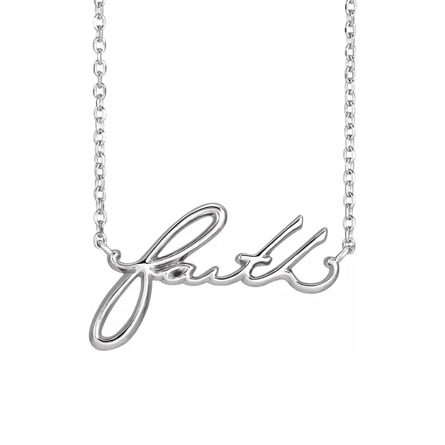 This tasteful 'Faith' Script Necklace is crafted from 14k white gold for a timeless, classic look. Wear it yourself as a graceful reminder of your devotion or give it as a beautiful token to a loved one. Perfectly sized for a delicate, yet thoughtful touch, inspire faithful sentiment with this exquisite necklace!
