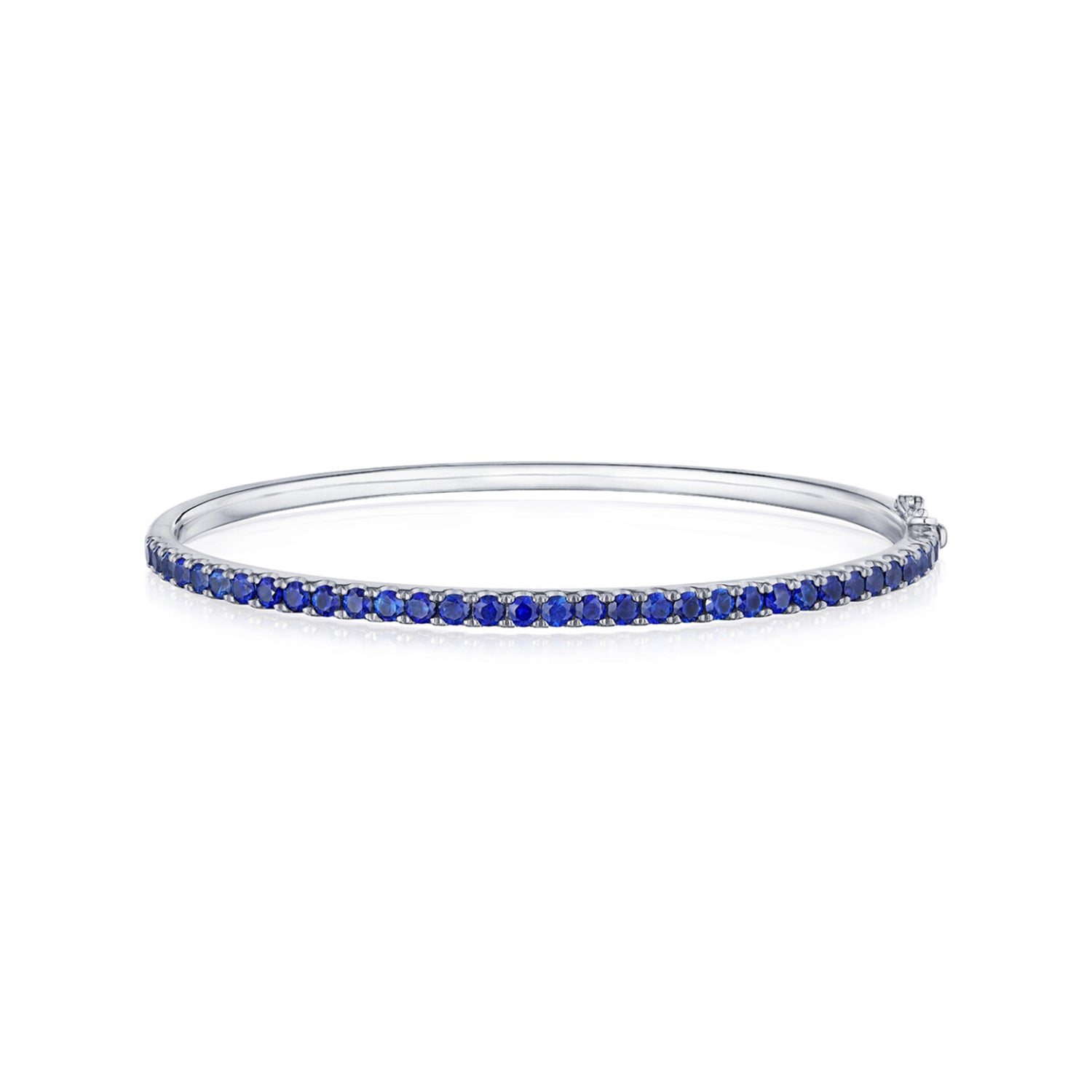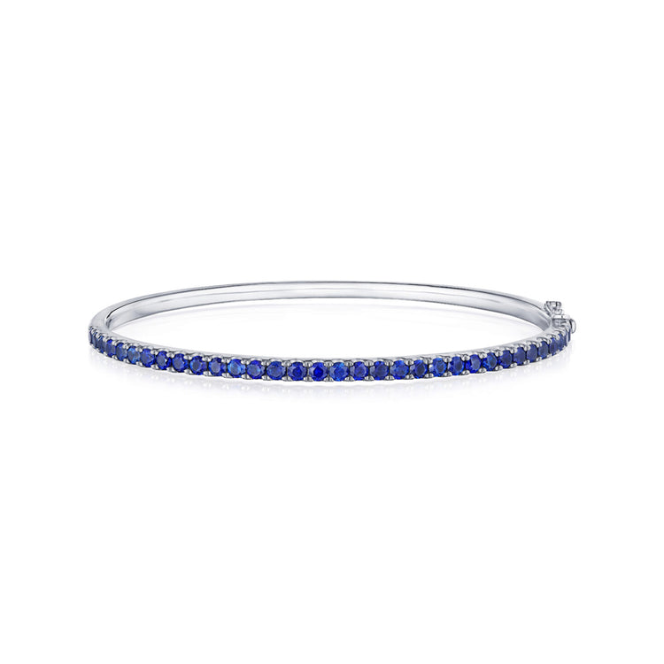 This sparkling bangle makes a subtle statement on its own or adds color to your bracelet stack. Exquisite sapphires are meticulously set in 18k white gold for a look that’s at once modern and timeless. The secure yet easy-to-operate clasp means you don’t need to slide it over your hand, which allows for a sleek oval shape that follows the lines of the wrist.