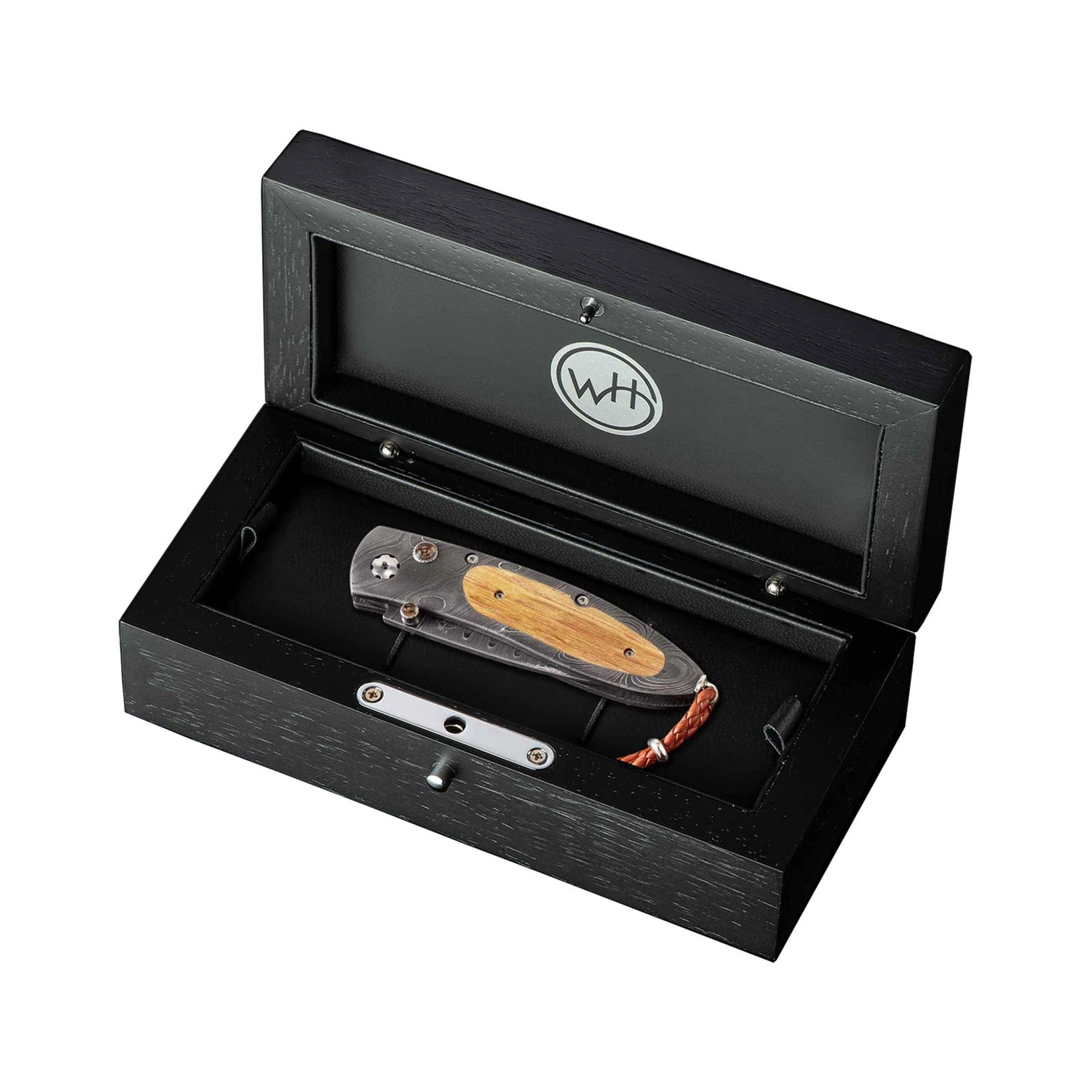 The Monarch 'Pappy II' features a beautiful frame in hand-forged 'Twist' damascus by Chad Nichols, inlaid with barrel wood from Pappy Van Winkle Bourbon. The blade is 'Wave' damascus with a VG-10 core; the one-hand button lock and the thumb stud are set with smoky quartz gemstones. The Monarch is a simple design that is easy on the eye and effortless in the hand; the elegant shape of the handle on this design is also an ideal canvas to showcase fine hand-engraving or exotic materials. The ‘Pappy II’ features some of the exotic materials, and hand-forged metals that are the hallmark of William Henry's collections; a timeless heirloom to be proudly worn and used for a lifetime before handing it down to another generation.