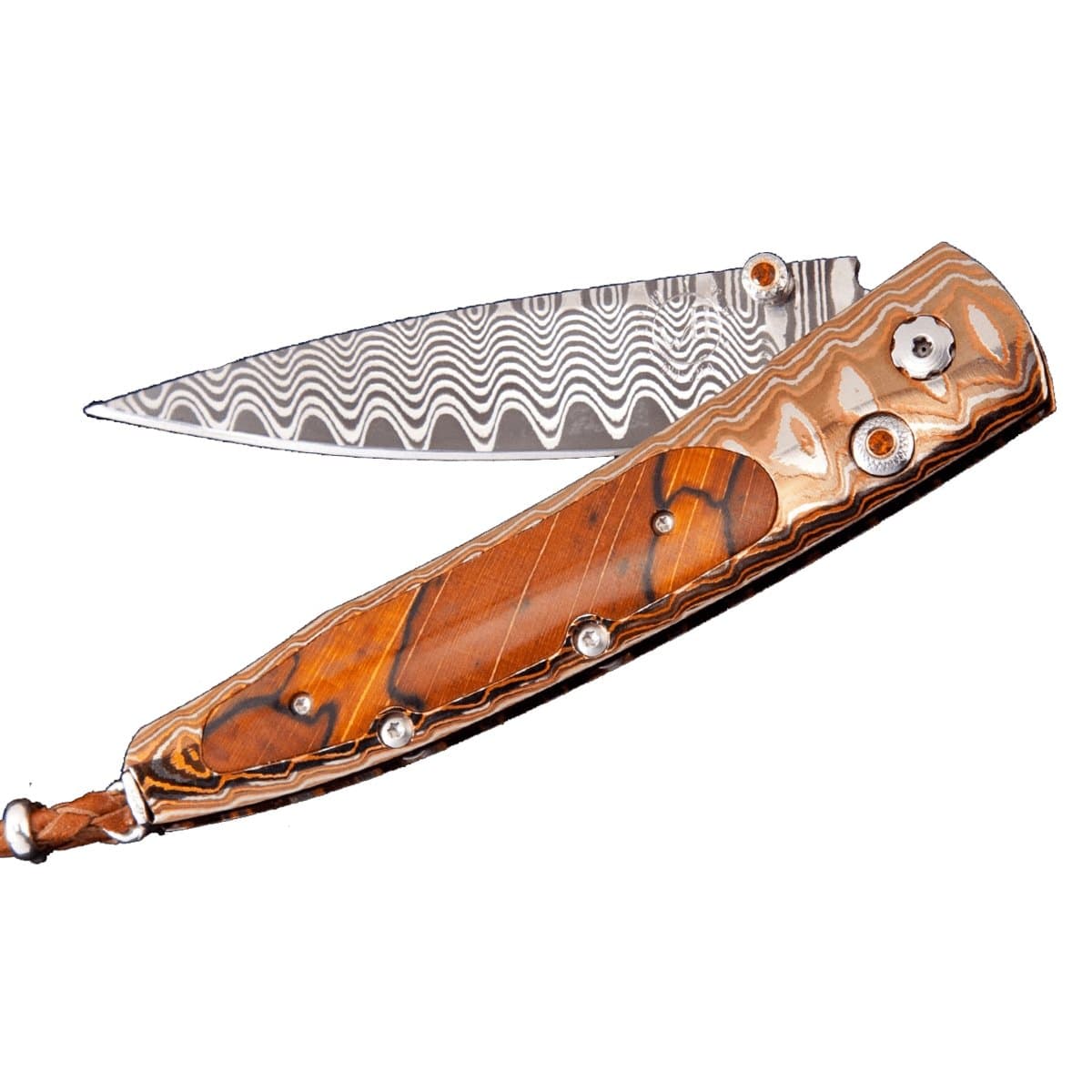 The Lancet 'Taos' features a beautiful frame in 'Wave Mokume', inlaid with orange spalted beechwood. The blade is 'Wave' Damascus with an extra strong core in ZDP-189; the one-hand button lock and the thumb stud are set with citrines.