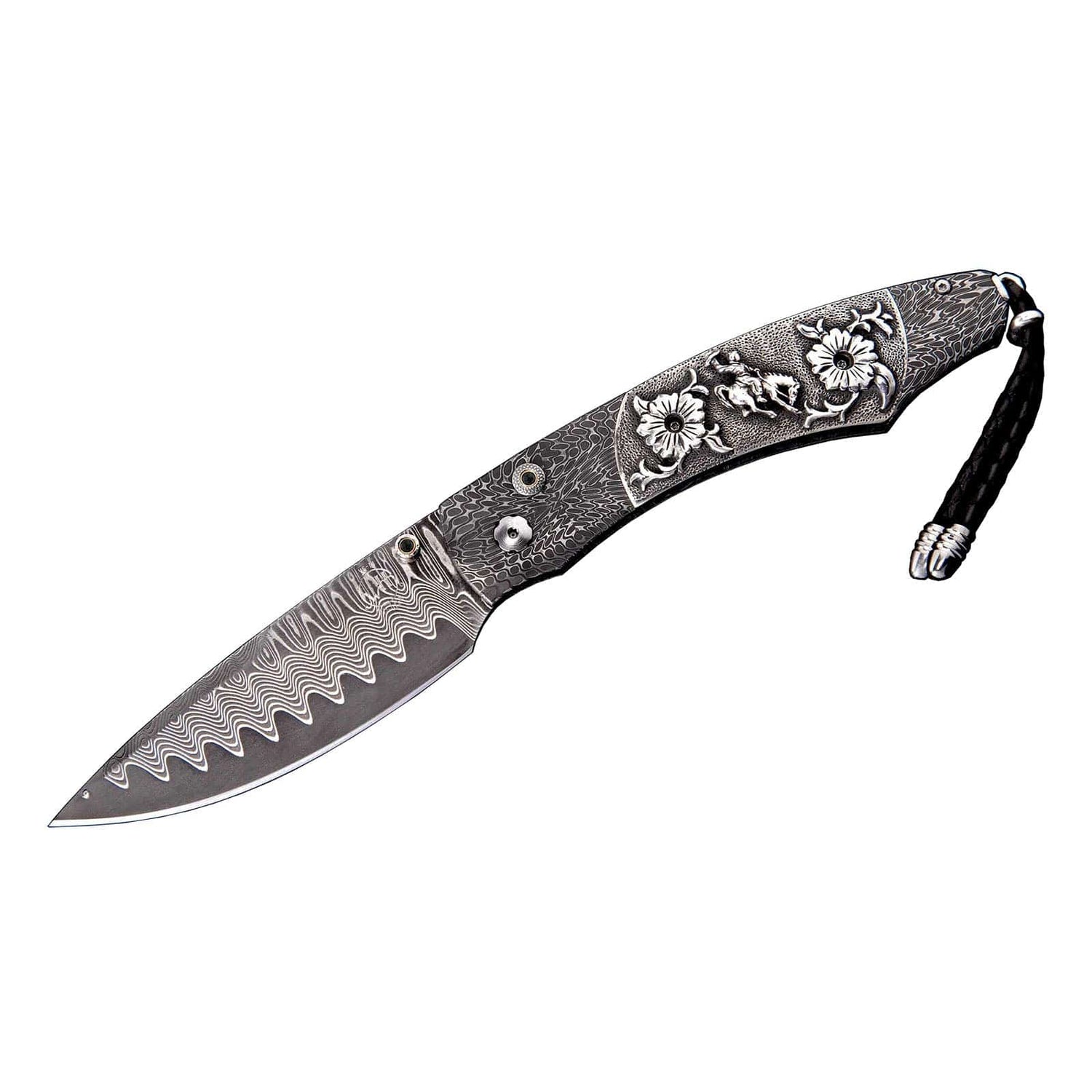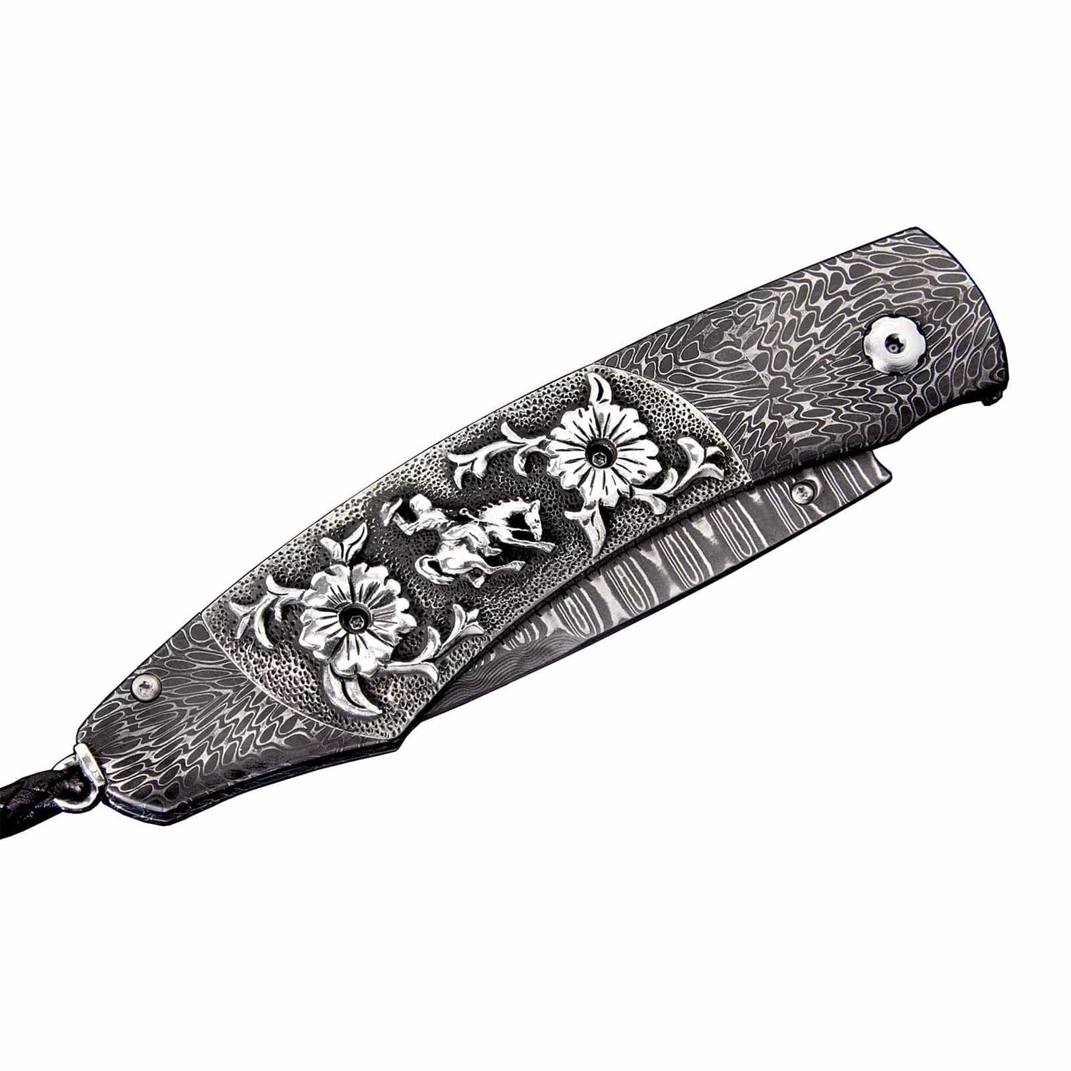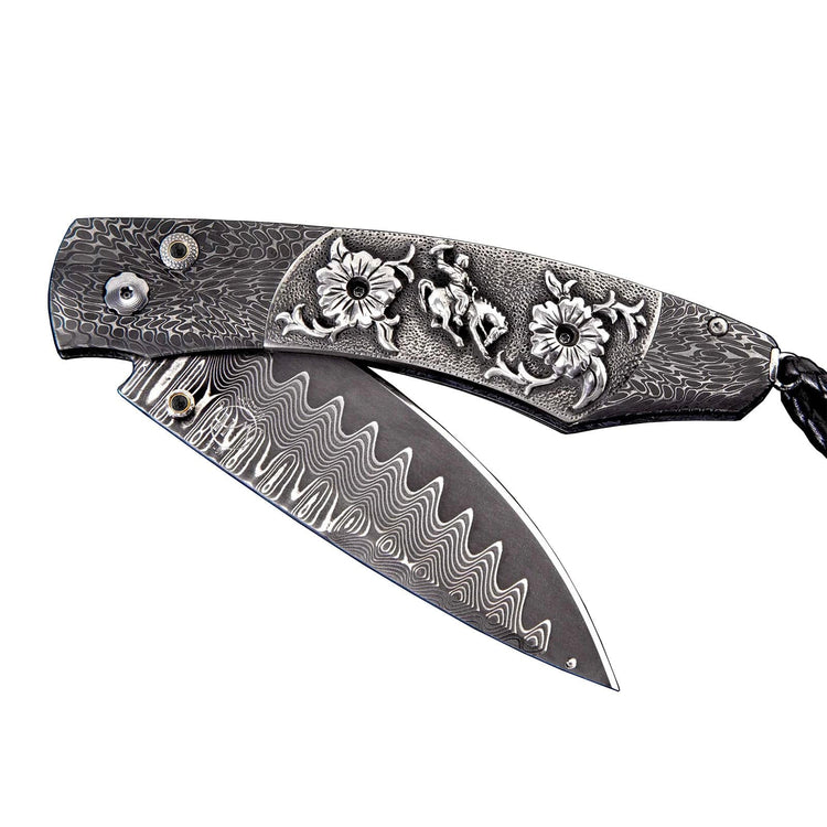 The Spearpoint ‘Ride' features a frame in hand-forged 'River Rock Damascus by Chad Nichols, inlaid with hand-carved sterling silver scales by Lee Downey. The blade is 'Wave' Damascus with an extra strong core of VG-10; the one-hand button lock and the thumb stud are set with black spinel gemstones. A remarkable design that gives you an instrument with a full-size secure grip, and a versatile deep-belly blade, the Spearpoint epitomizes William Henry’s core philosophy – that superlative function deserves to be elevated to superlative art. The ‘Ride’ features some of the exotic materials and hand-forged metals that are the hallmark of William Henry's collections; a distinctive personality statement to be worn and used for a lifetime.