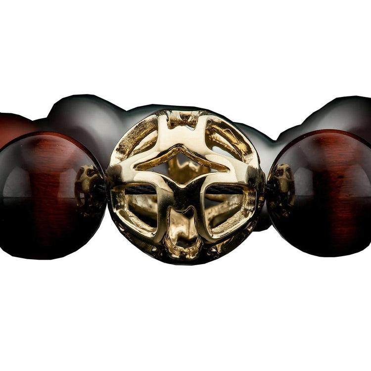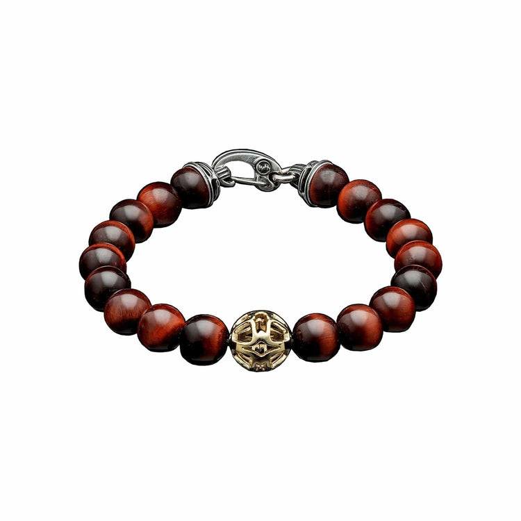 Express yourself with this stunning bracelet from William Henry's Oregon studio. The Golden Hour features a centerpiece sculpted from 18K yellow gold, with the undulating tones of red tiger's eye beads. Built on our durable aircraft grade stainless cable, with a welded sterling silver clasp system. Simple, elegant, and worthy of attention without working too hard at it.
