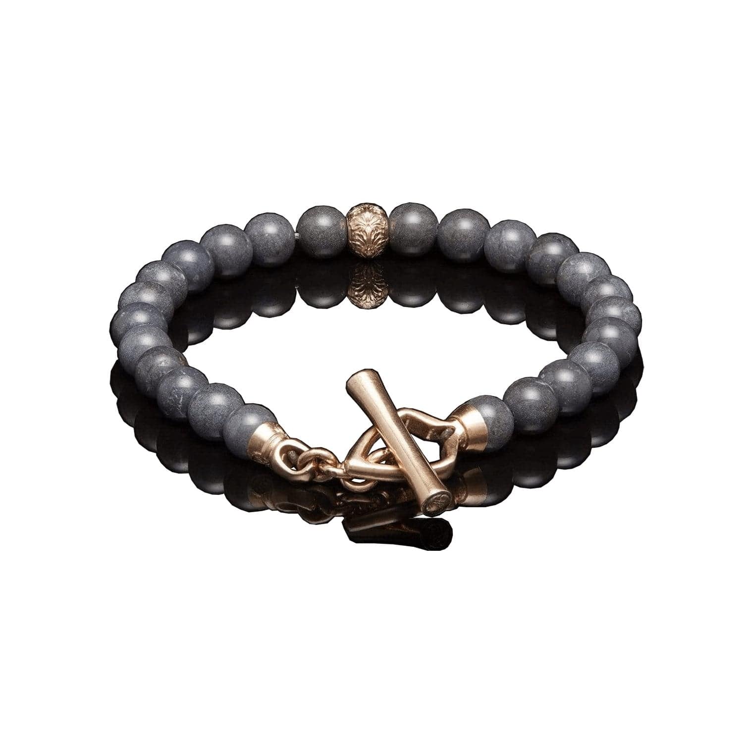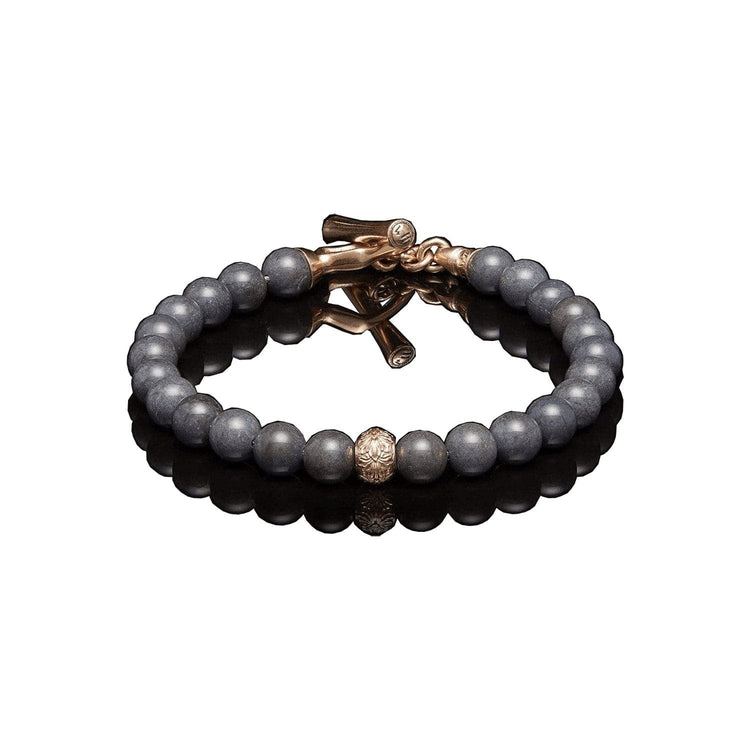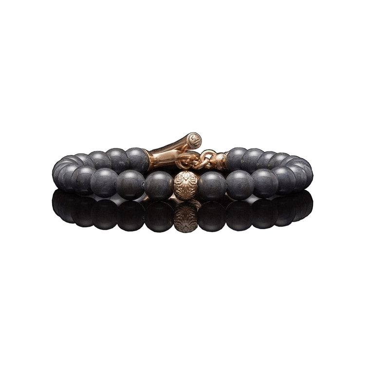 As soon as they saw the perfect rich grey of this jasper (found only in Oregon, William Henry's home state), they knew they had to design something that paired it with rose gold. The ‘Bandon’ bracelet brings it all together, with a solid 18K rose gold center bead and ‘arrow’ toggle clasp, as luxury accents to the beautiful stone beads. Built on welded aircraft cable to last for generations. Less is, in this case, definitely more.