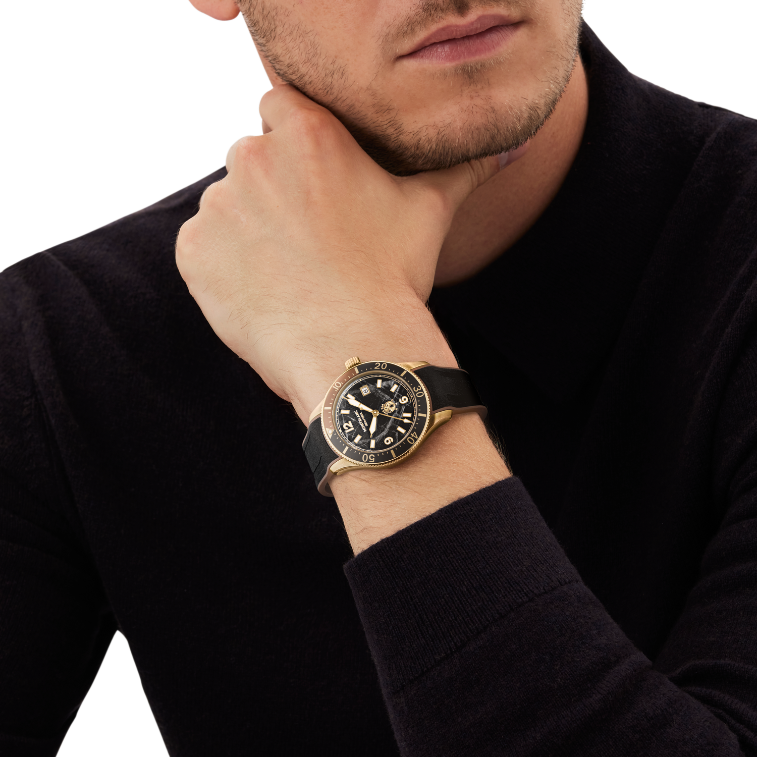 Capturing the colour of the setting sun over the glacier, this Montblanc Iced Sea Automatic Date combines a black glacier pattern dial with a warm bronze case. The glacier pattern dial is inspired by the Mer de Glace - Sea of Ice - the main glacier of the Mont-Blanc Massif. Its texture was achieved using an almost-forgotten ancestral technique called gratté-boisé. This bronze edition comes with a bi-colour unidirectional anodized aluminum bezel, a 3D engraving on the bronze-coated titanium case back, and an interchangeable black rubber strap with brown outline and fine adjustment system. It is water-resistant to 300 meters.