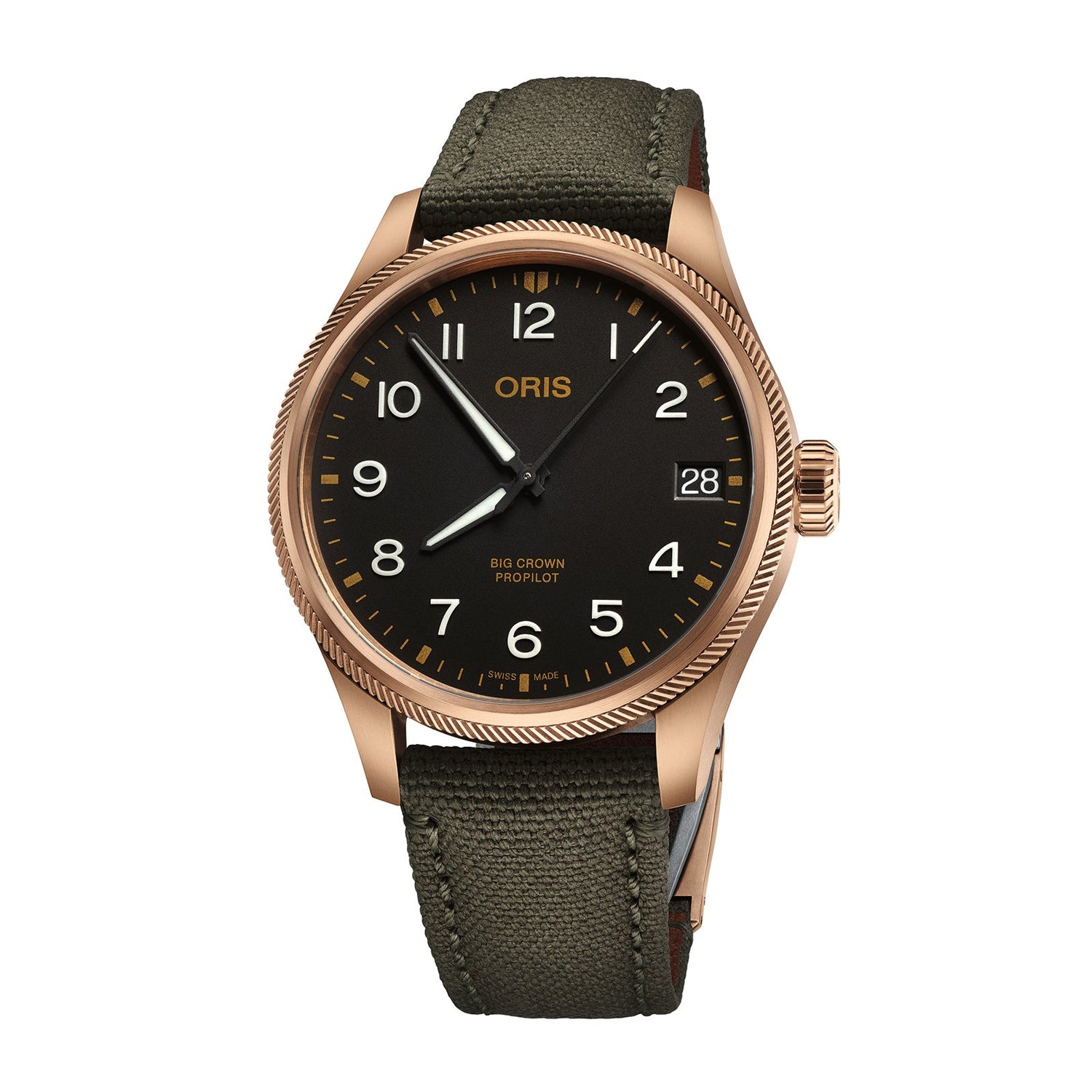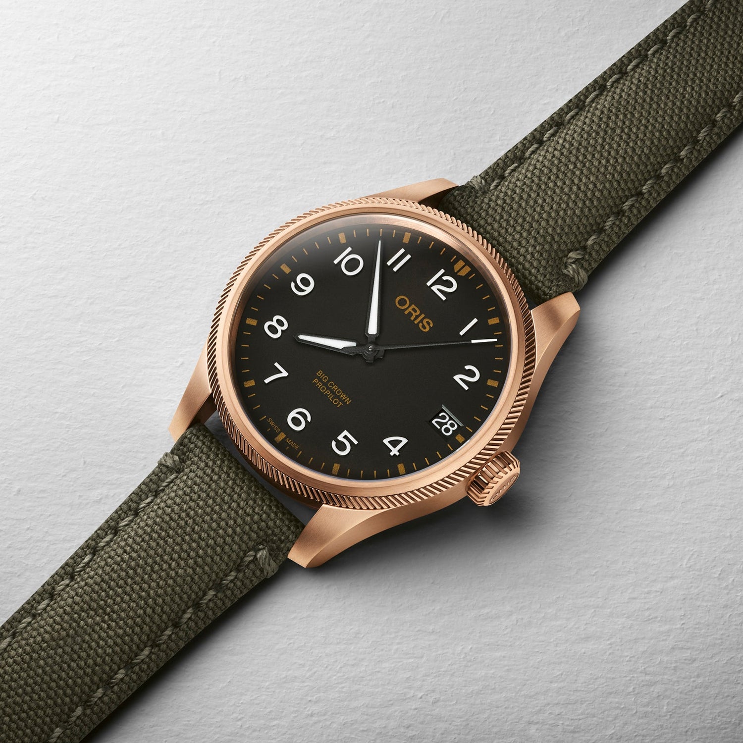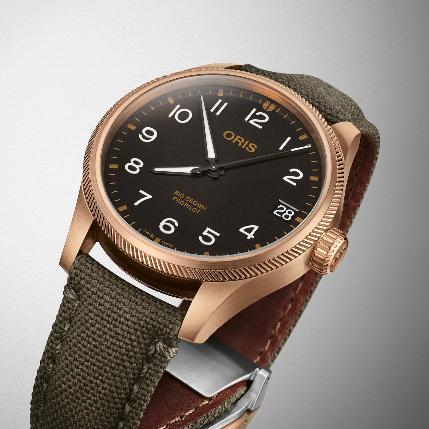 Flair Time - Oris has been experimenting with bronze in its diver’s watches for years - now, for the first time, the independent Swiss watch company has given its highly competent Big Crown ProPilot Big Date fresh flair by casing it in bronze, too. The warm tones of the new model come from its bronze case, fluted bezel and signature oversized crown, which are complemented by a deep black dial with printed golden indices. This is a true pilot’s watch, so the hands are filled with white Super LumiNova® and the applied hour markers made from solid Super LumiNova®, creating high contrast and first class readability. Finishing off the stylish look is a hard wearing green Ventile® strap with Oris’s playful ‘Lift‘ clasp, also in bronze, a device inspired by passenger aircraft seat belt buckles. As with every Oris, inside the watch is a highly reliable Swiss Made mechanical movement. In this case, that movement is a precision automatic with an oversized big date.