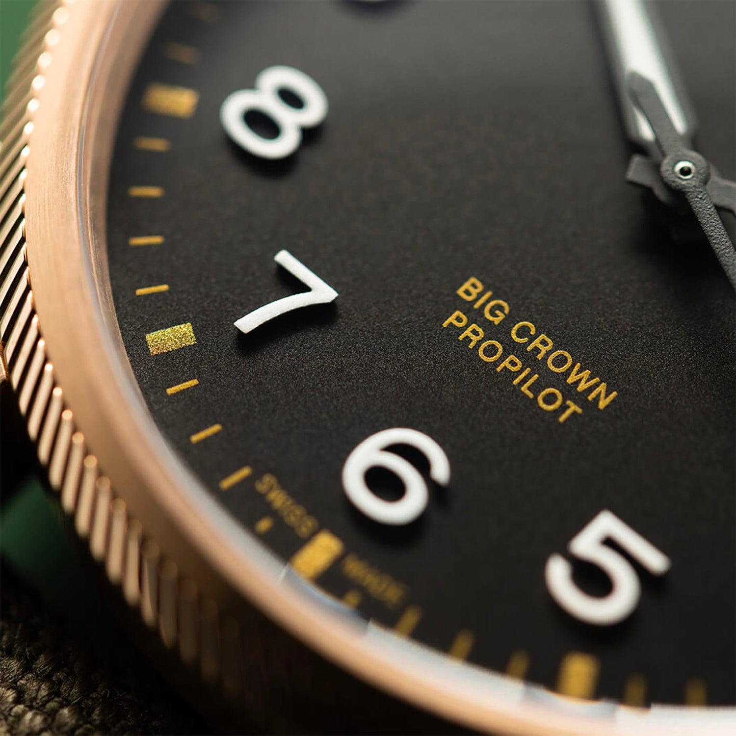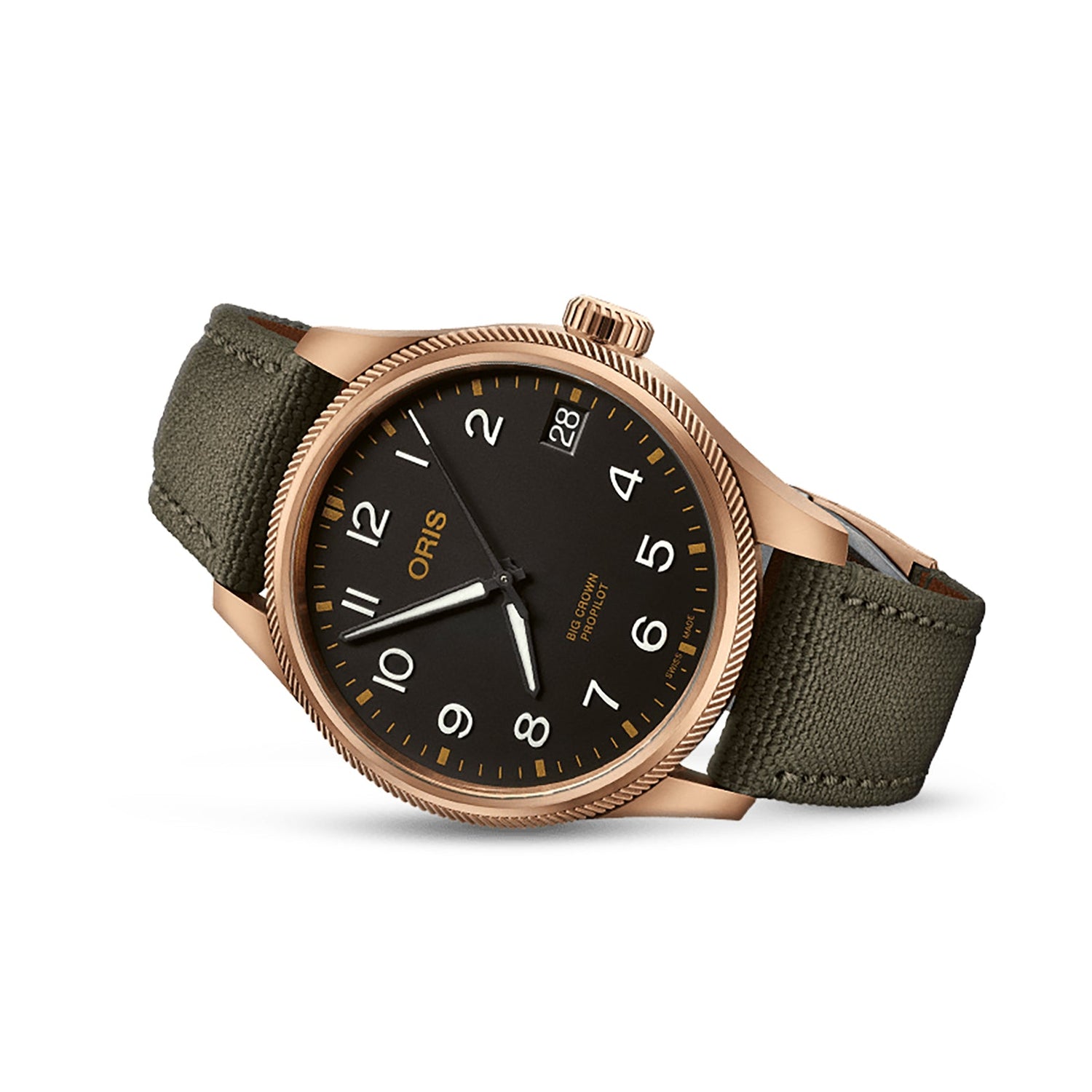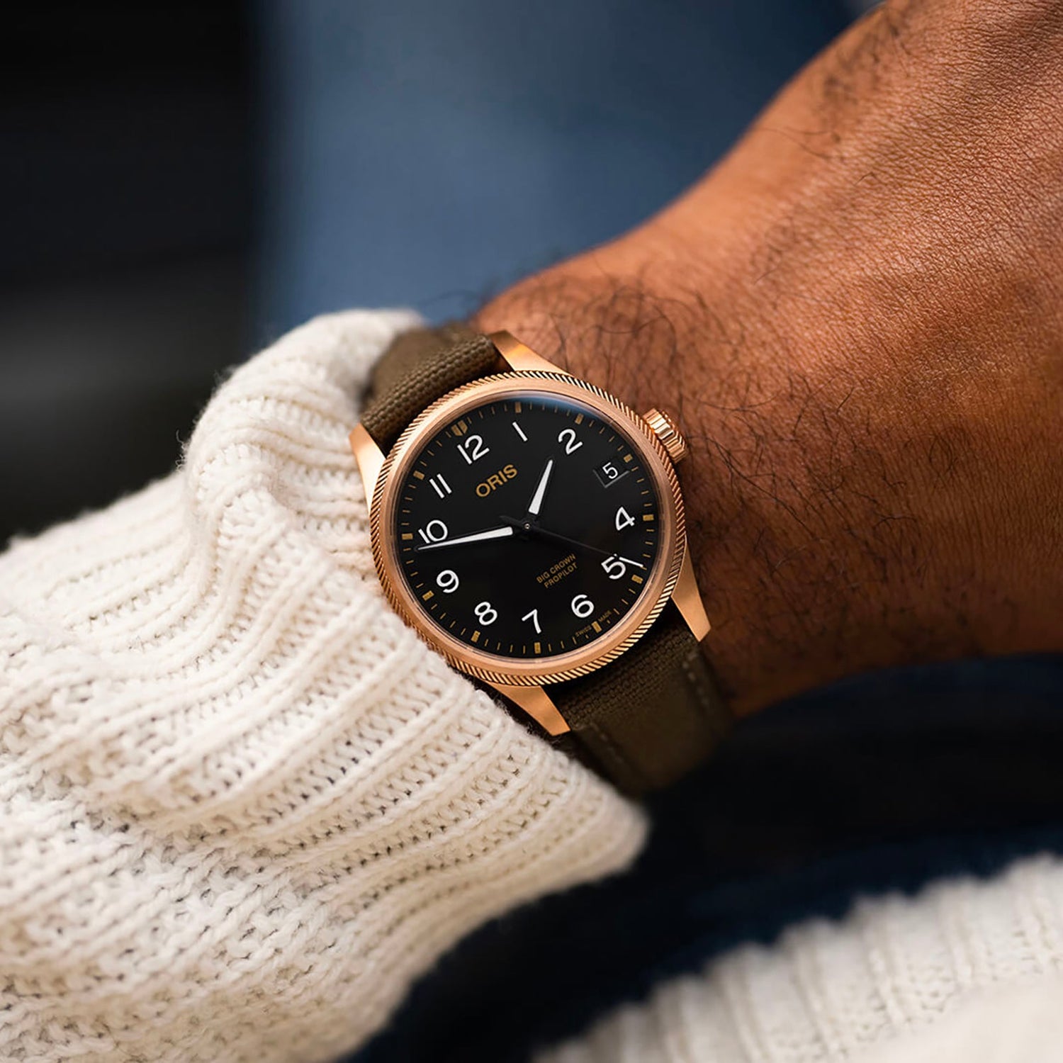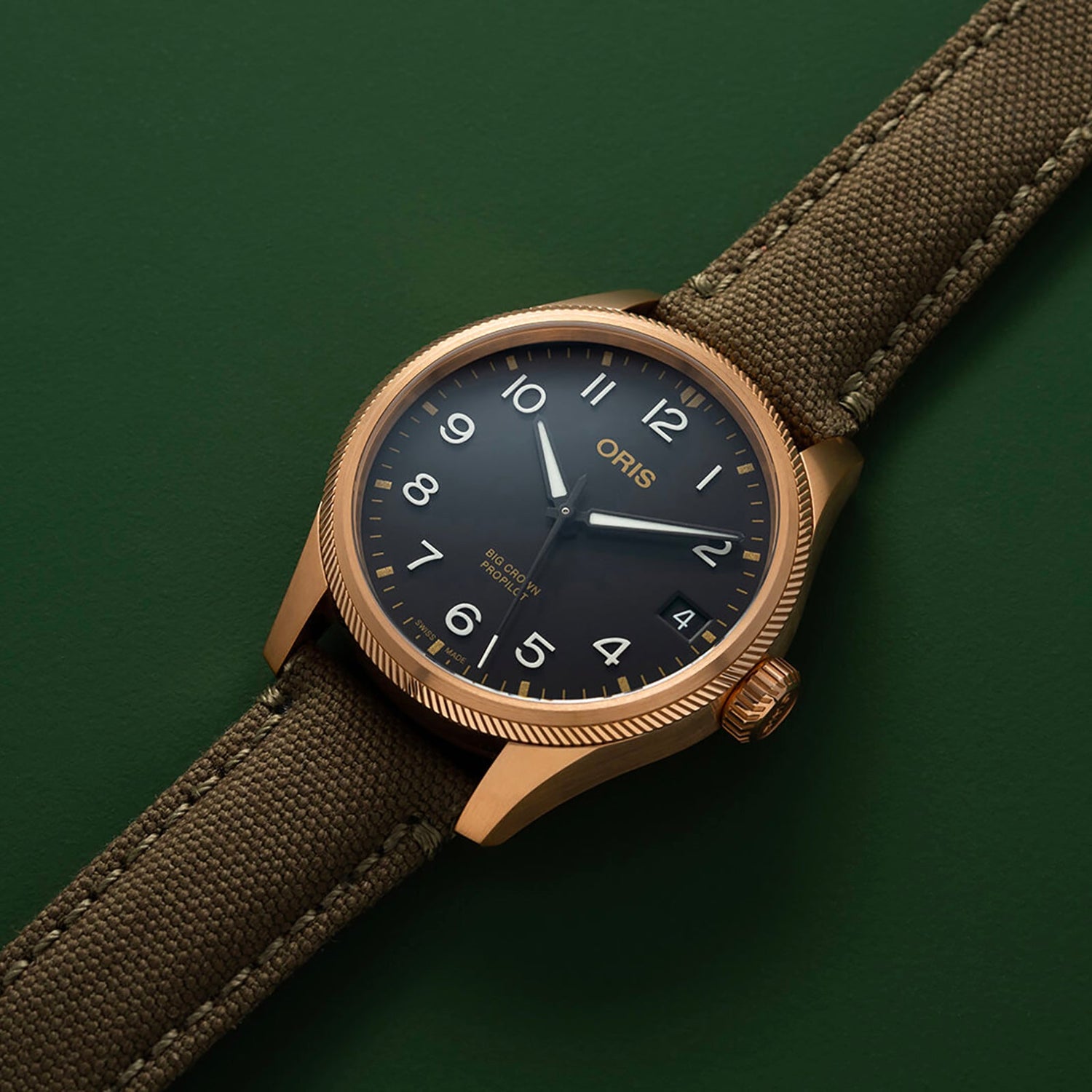 Flair Time - Oris has been experimenting with bronze in its diver’s watches for years - now, for the first time, the independent Swiss watch company has given its highly competent Big Crown ProPilot Big Date fresh flair by casing it in bronze, too. The warm tones of the new model come from its bronze case, fluted bezel and signature oversized crown, which are complemented by a deep black dial with printed golden indices. This is a true pilot’s watch, so the hands are filled with white Super LumiNova® and the applied hour markers made from solid Super LumiNova®, creating high contrast and first class readability. Finishing off the stylish look is a hard wearing green Ventile® strap with Oris’s playful ‘Lift‘ clasp, also in bronze, a device inspired by passenger aircraft seat belt buckles. As with every Oris, inside the watch is a highly reliable Swiss Made mechanical movement. In this case, that movement is a precision automatic with an oversized big date.