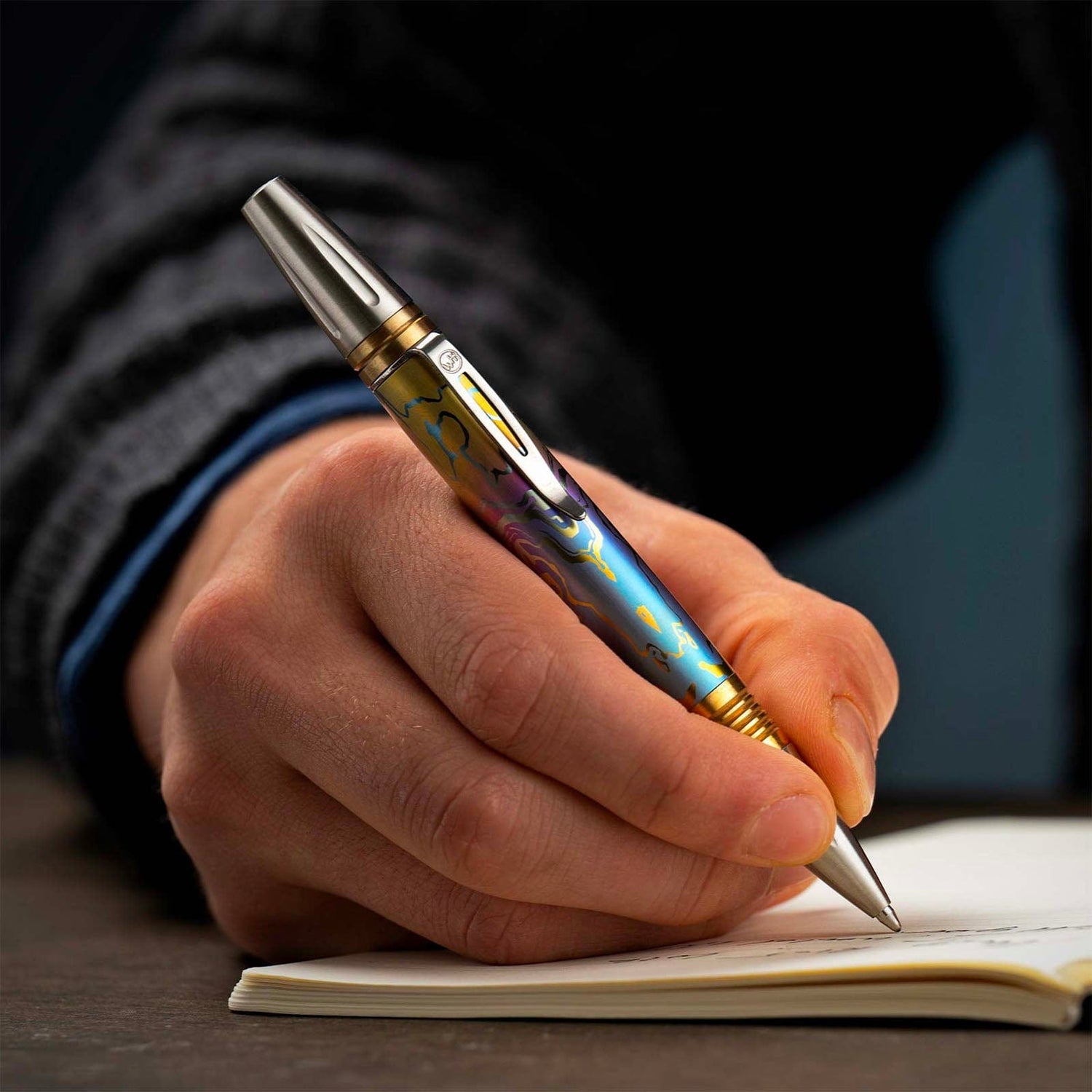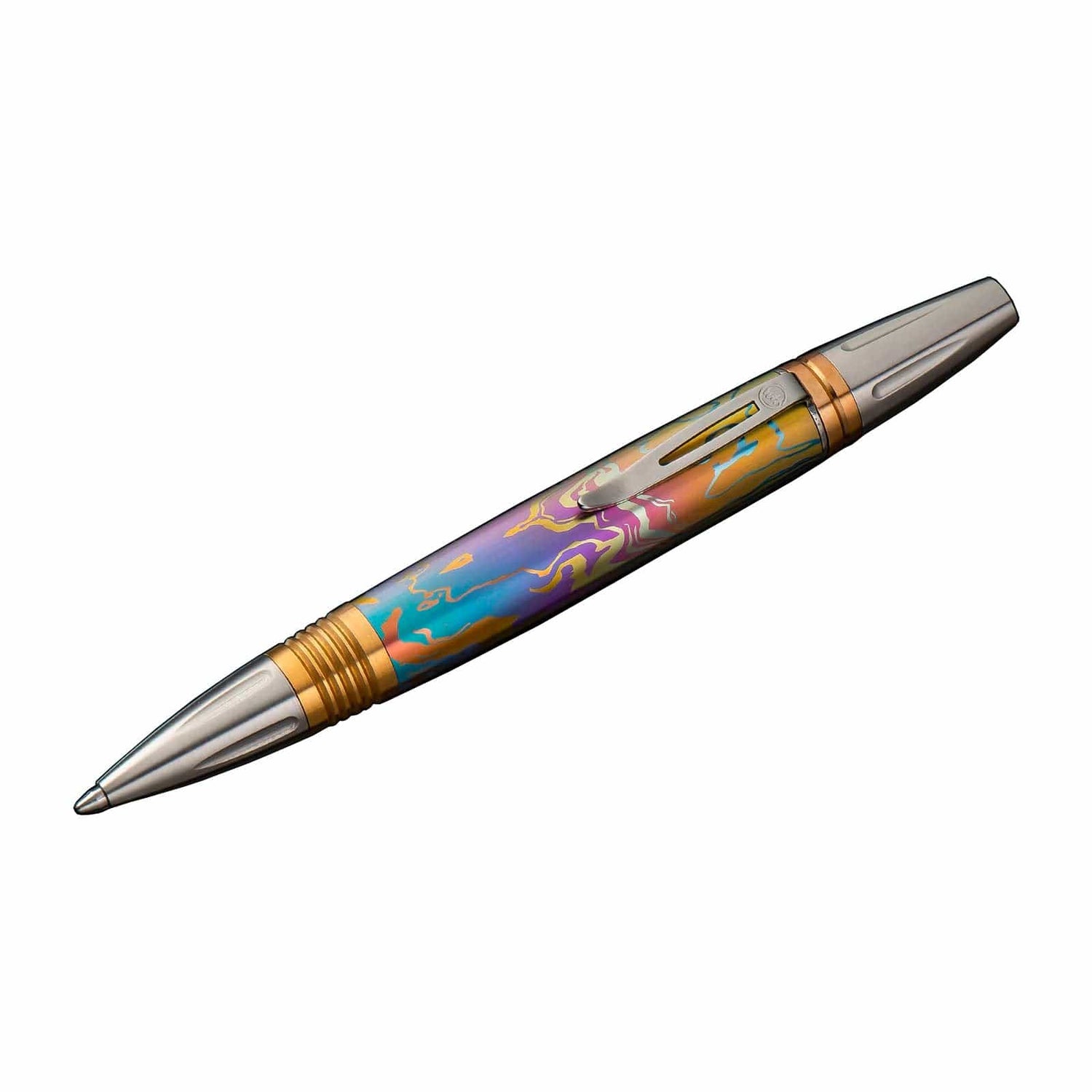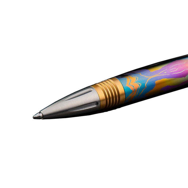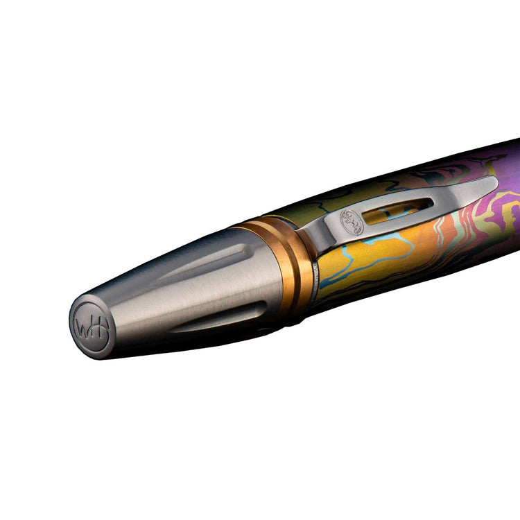 William Henry's modern take on the classic executive pen, the Caribe features a barrel sculpted and hand-finished from stylish patterned and anodized titanium. The exceptional and distinctive titanium pattern is flanked by brass spacers with deep grooves for a secure grip, and the tip and top section are crafted from stainless steel with art deco details. The writing tip is revealed through William Henry's top-twist mechanism and features a top quality refill cartridge from Germany for smooth writing. Substantial without being overbearing, a writing instrument that will serve for generations.