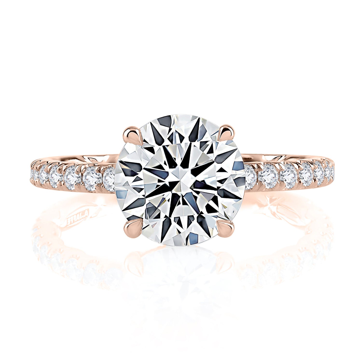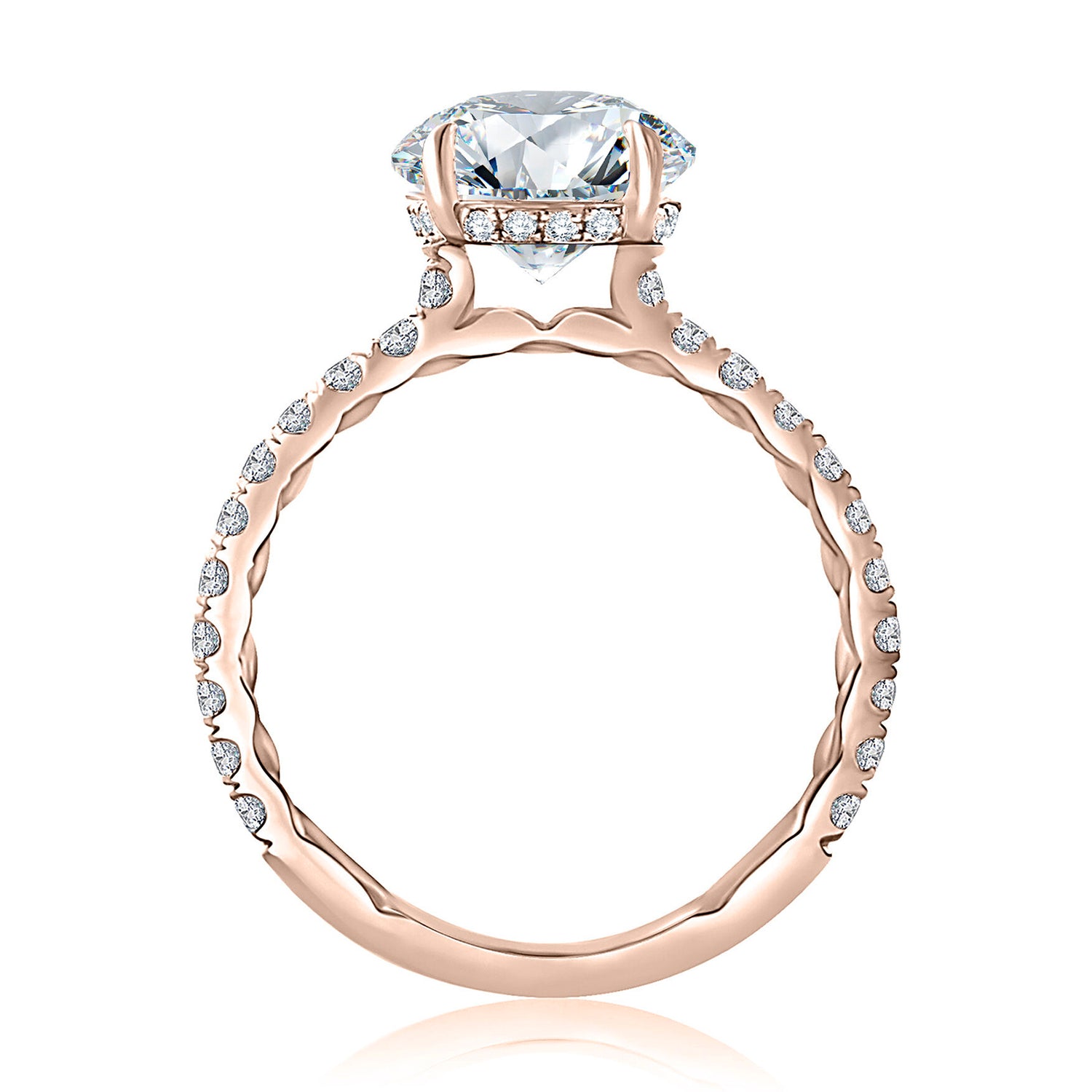 Indulge in the timeless beauty of A. Jaffe's Diamond Semi Mount Ring. Expertly crafted from 14k rose gold, this ring is designed to showcase a round center stone. Glittering diamonds elegantly flow down the shank while a sparkling collar encircles the basket setting. The quilted interior adds a touch of graceful refinement for style and comfort.