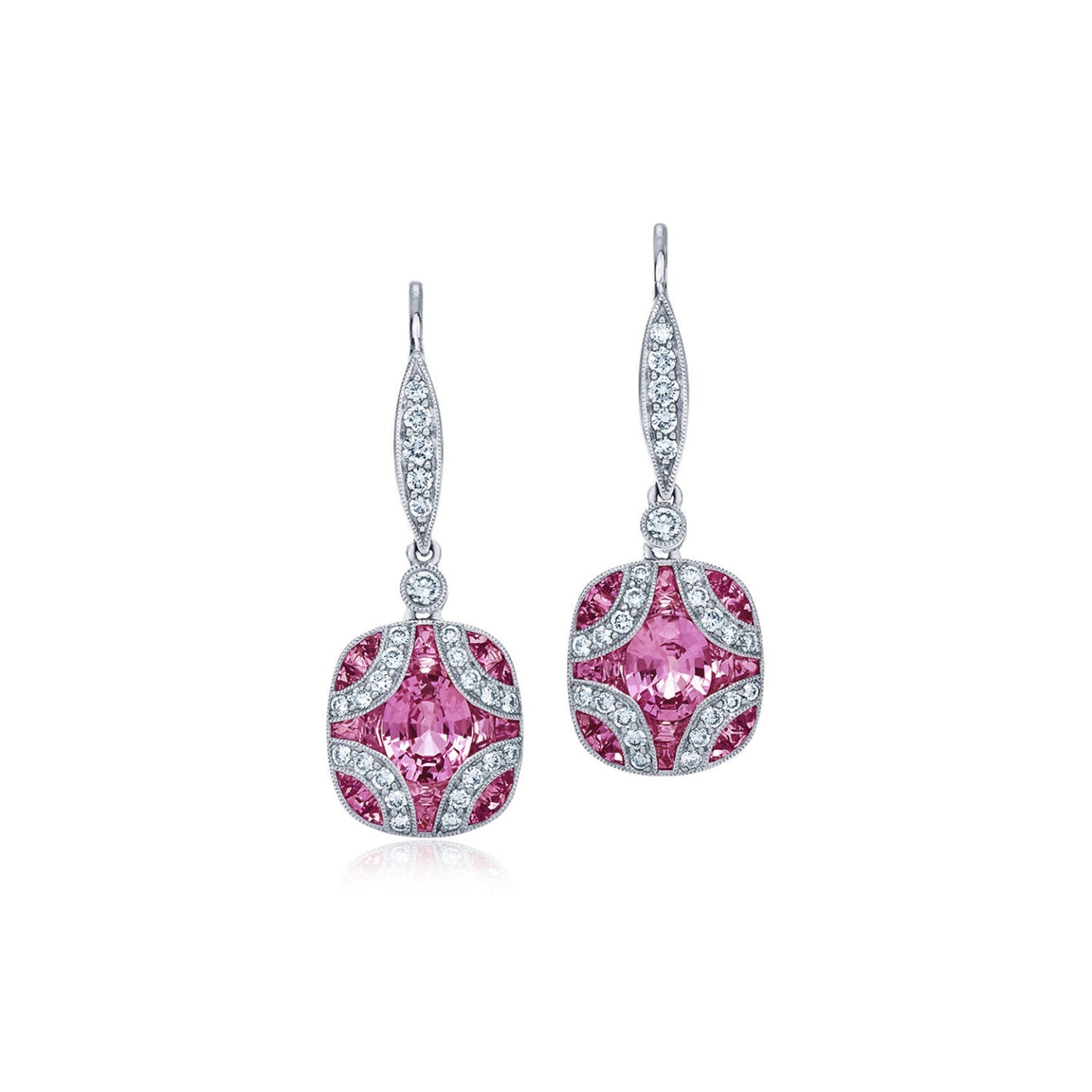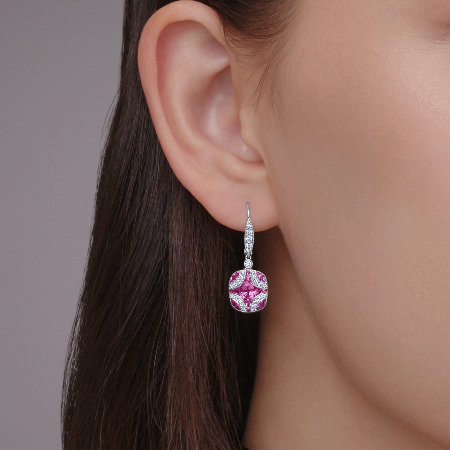 A graceful, geometric motif of color and light captures early 20th century style in elegant 18k white gold earrings set with pink sapphires and diamonds. Kwiat artisans handcraft this design with exquisite gemstones and meticulous care to ensure beauty and brilliance.