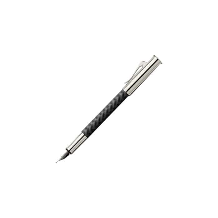18k white gold rhodium Guilloche Ciscele brown fountain pen with hand-engraved Guilloche pattern with a resin barrel. The deep matte surface is combined with a shimmering engraving and rhodium-plated metal parts. The nib is rhodinized 18k white gold. The inline width is medium and features a solid metal spring clip.