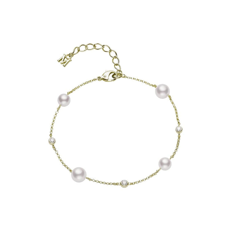 Mikimoto's Akoya cultured pearl and diamond station bracelet offers variety to everyday wear. The pieces are designed to be worn on their own as a statement, or layered with other designs for a more detailed look. This bracelet features 6.5-5.5mm A+ Akoya cultured pearls with 0.15ct of diamonds set in 18K yellow gold.