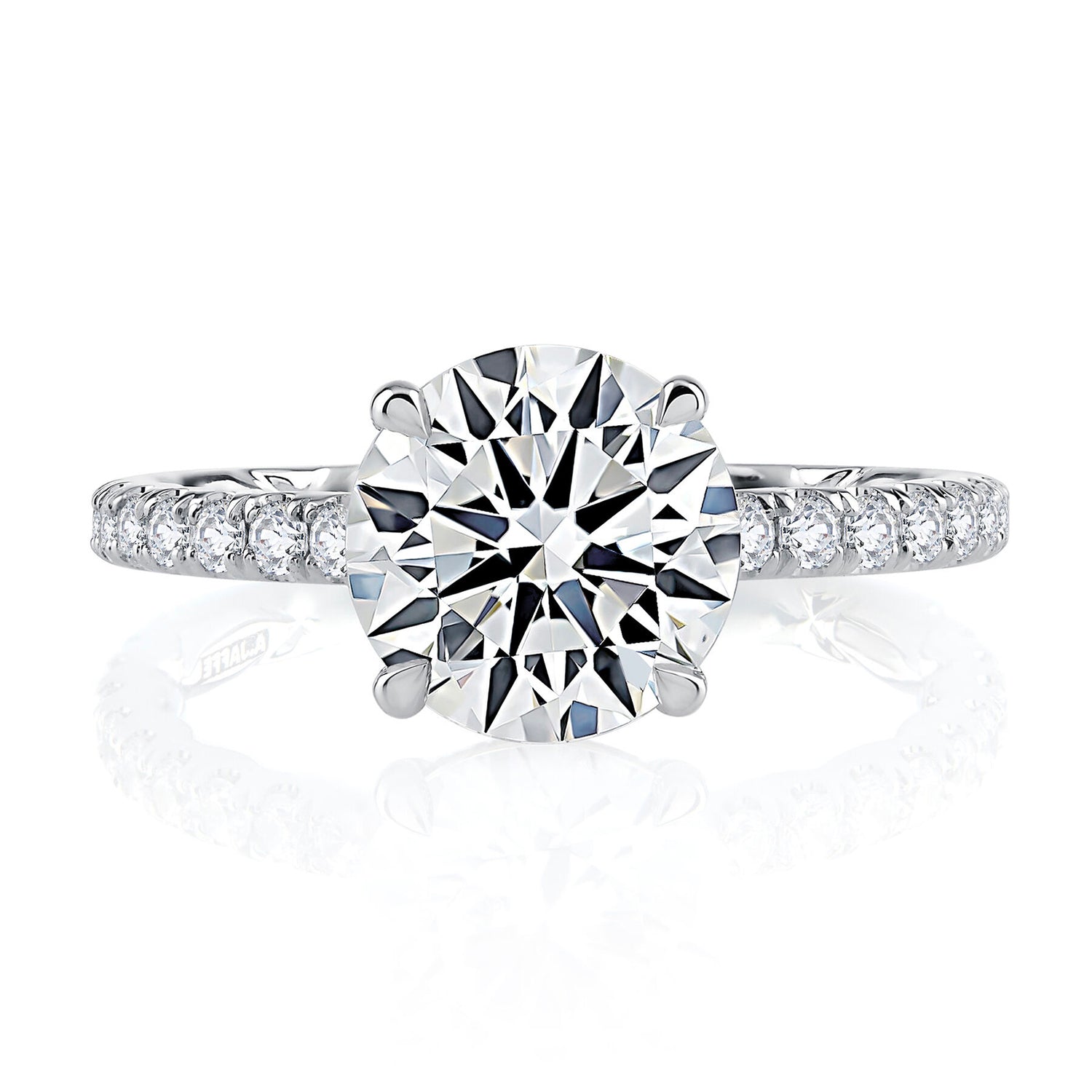 Indulge in the timeless beauty of A. Jaffe's Diamond Semi Mount Ring. Expertly crafted from 14k white gold, this ring is designed to showcase a round center stone. Glittering diamonds elegantly flow down the shank while a sparkling collar encircles the basket setting. The quilted interior adds a touch of graceful refinement for style and comfort.