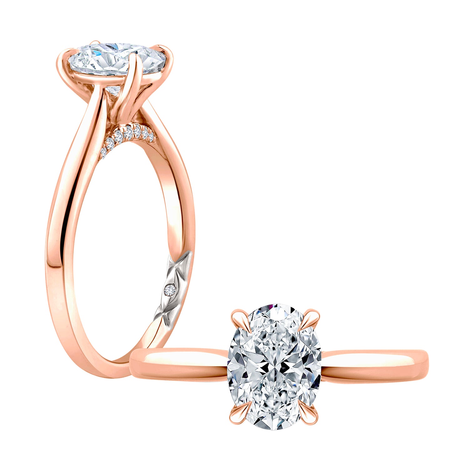 Indulge in luxury with A.Jaffe's Diamond Semi Mount Ring. Crafted in 14k rose gold with a touch of quilted white gold, this ring features an oval center and sparkling round brilliant accents. Plus, a hidden diamond in the white gold interior adds an extra lucky touch.