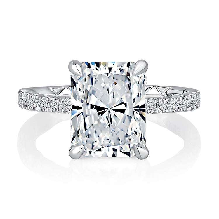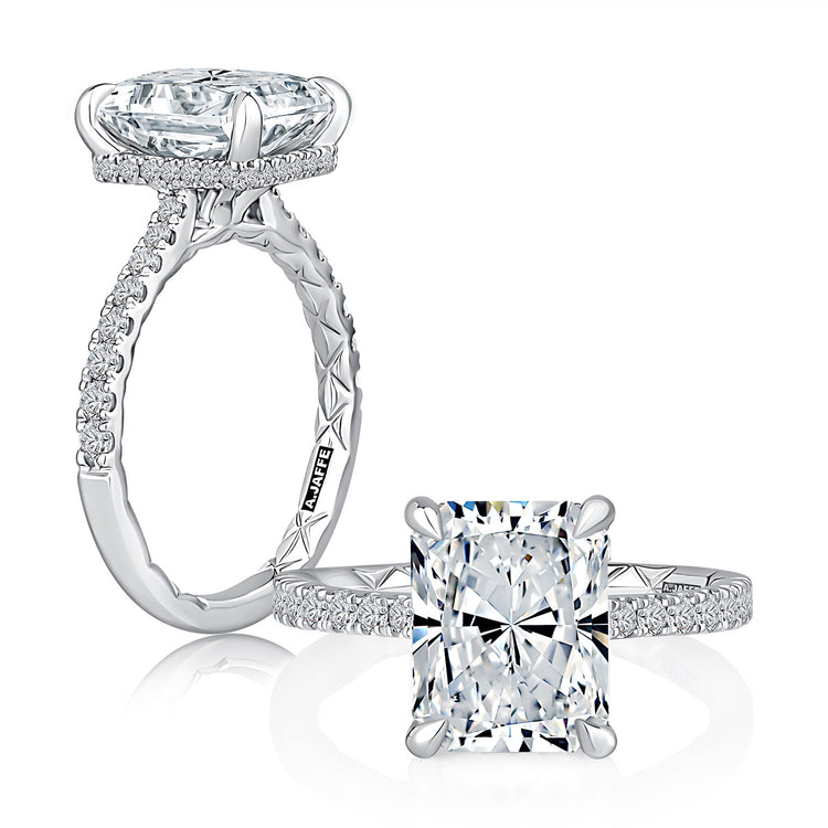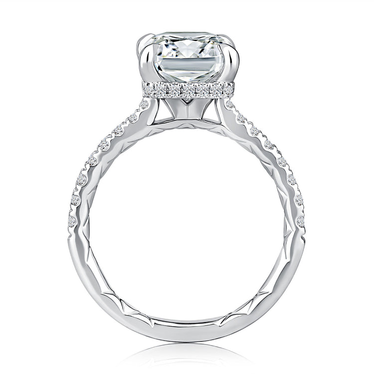 Indulge in the timeless beauty of A. Jaffe's Diamond Semi Mount Ring. Expertly crafted from 14k white gold, this ring is designed to showcase a square center stone. Glittering diamonds elegantly flow down the shank while a sparkling collar encircles the basket setting. The quilted interior adds a touch of graceful refinement for style and comfort.
