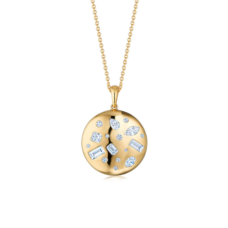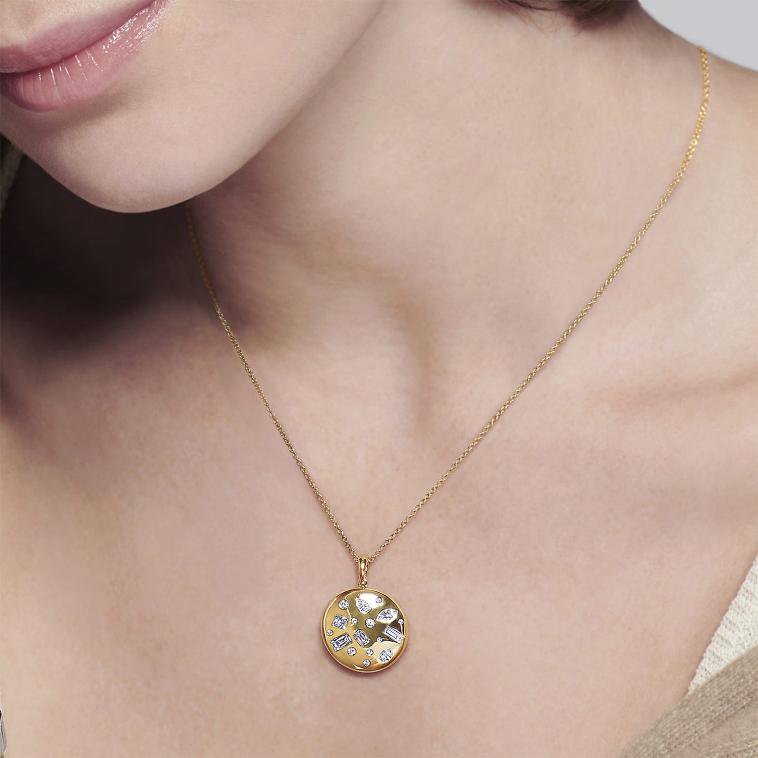 In the Cobblestone collection, smooth round forms sparkle with diamond accents—a modern, everyday way to shine. This beautiful 18k yellow gold disc pendant is scattered with an array of fancy shape diamonds that are burnish set for a sleek effect. Skilled Kwiat artisans meticulously select and place each stone to ensure a flush finish that’s secure and refined.