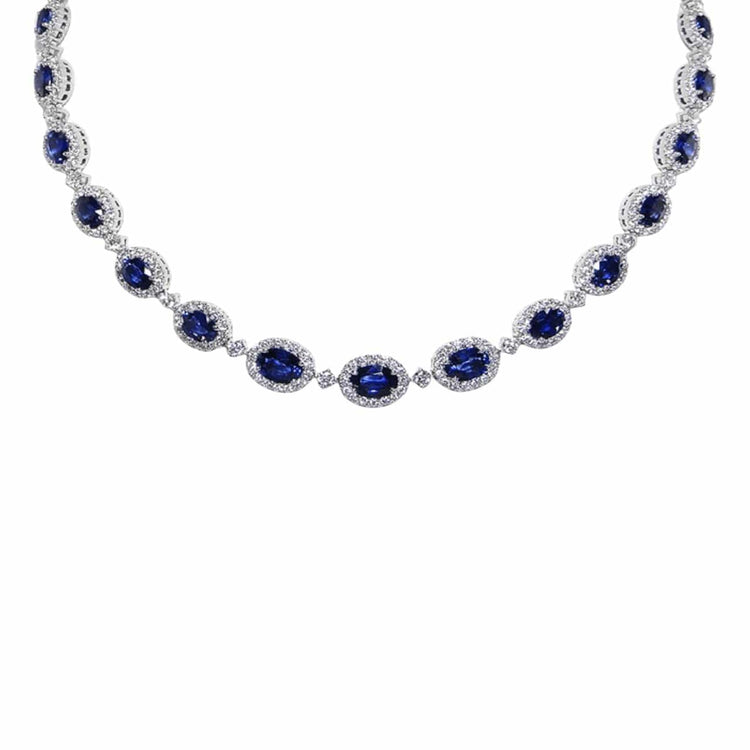 This stunning graduated halo necklace is crafted from 18k white gold and features 30 Sri Lanka blue sapphire ovals framed by round brilliant diamonds.