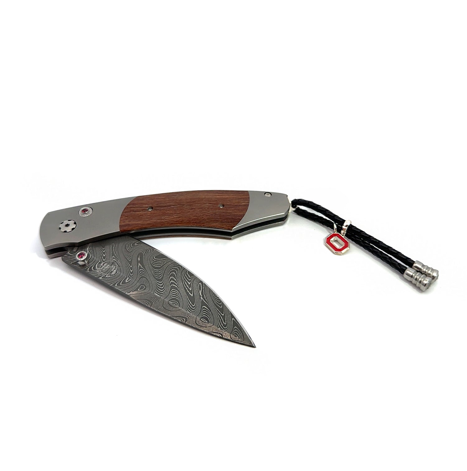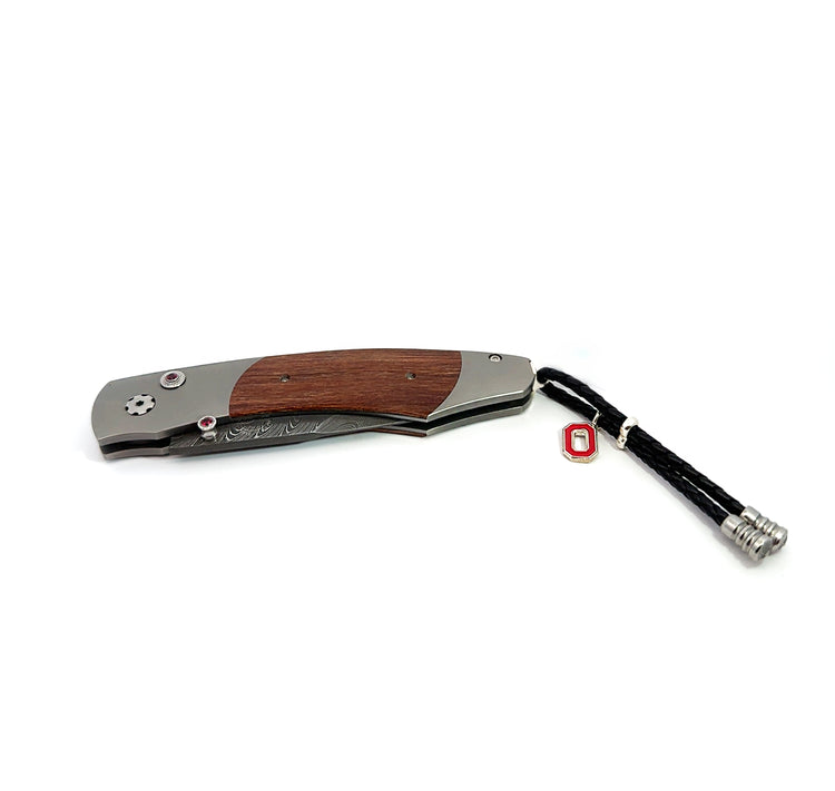 Introducing the Ohio State Stadium Bleacher Wood knife, a limited edition masterpiece made with authentic bleacher wood from the legendary Ohio State Stadium. This officially licensed knife features a Bolster Titanium handle, a Boomerang Damascus blade, and a Ruby gem embedded for added luxury. With only 25 available, this knife is a must-have for any passionate Ohio State fan.