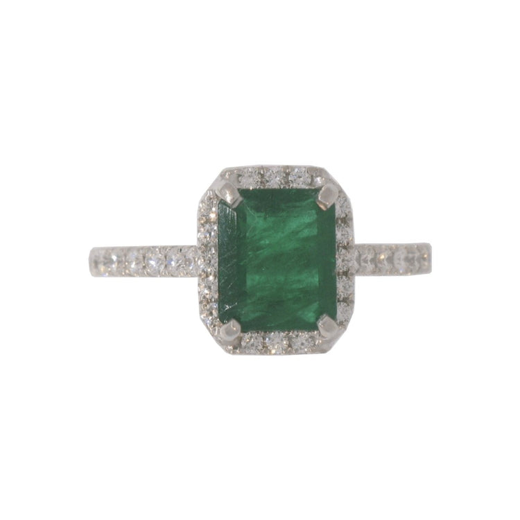 Experience the stunning beauty of our Emerald and Diamond Halo Ring. Expertly crafted from 14k white gold, this ring boasts a natural emerald center stone, surrounded by a dazzling halo of round brilliant diamonds that continue down the shank.