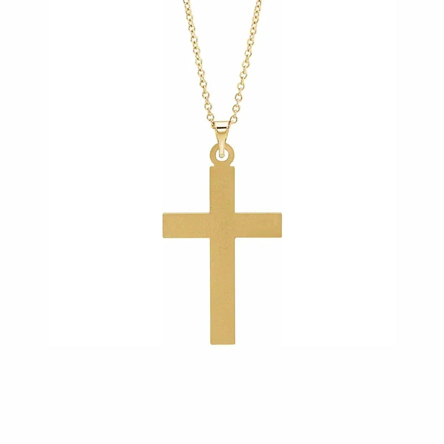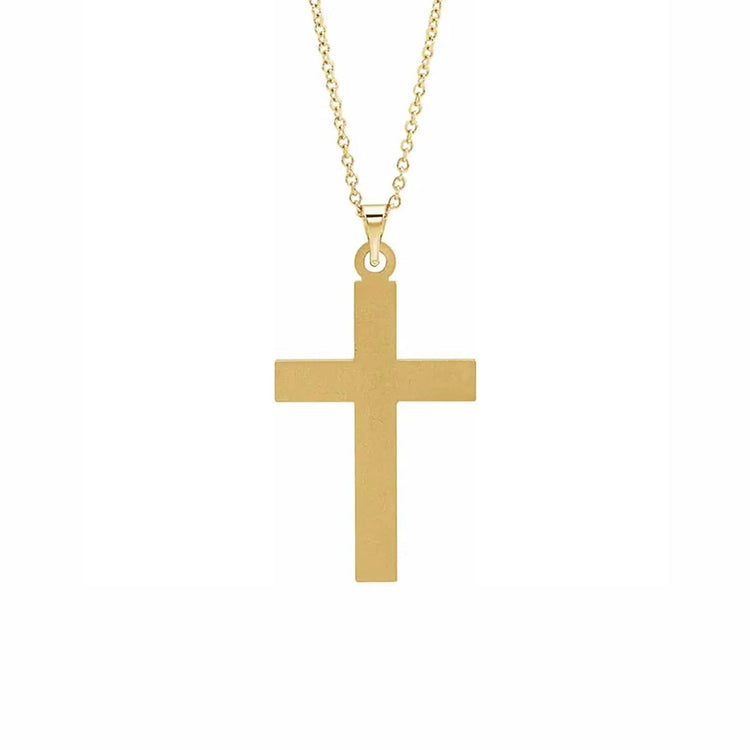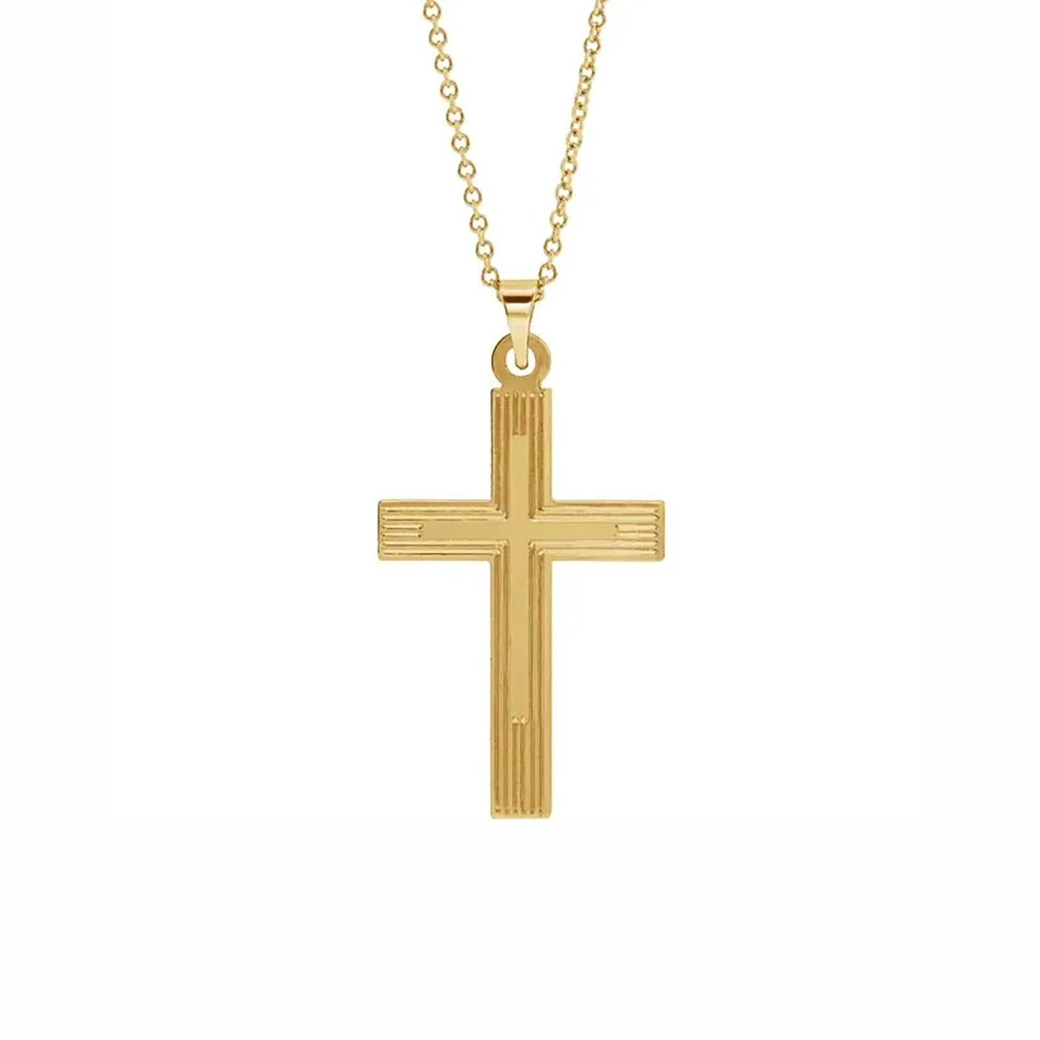 This stunning grooved cross pendant crafted from 14K yellow gold is a timeless religious symbol that celebrates your faith. The 25mm x 16mm pendant fastens securely to an 18-inch chain. Perfectly polished on the inside and grooved on the outside, this pendant is the perfect memento of your faith.
