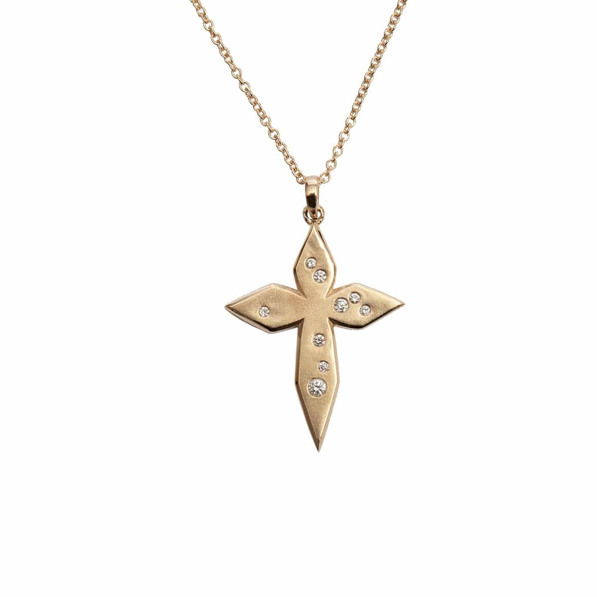 This unique Cross necklace has a modern, edgy look with it's nine scattered diamonds. Choose between 14k yellow or white gold, it's the perfect way to make a statement.