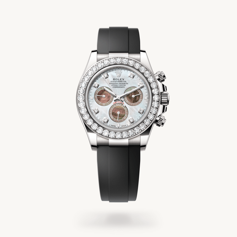 The 18 kt gold versions of the Cosmograph Daytona with a Cerachrom bezel are available with an Oysterflex bracelet. Developed by Rolex and patented, it singularly combines the robustness of a metal bracelet with the comfort of an elastomer bracelet. It is made up of two flexible curved metal blades – one in each bracelet section – overmoulded with high-performance black elastomer. For optimum comfort, the Oysterflex bracelet is equipped with cushions on its inner sides and an Oysterlock safety clasp to prevent accidental opening. Its length may be adjusted via the ingenious Rolex Glidelock extension system.