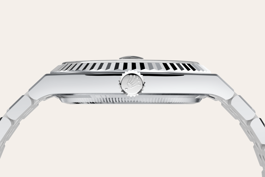 The Rolex fluted bezel is a mark of distinction. Originally, the fluting of the Oyster bezel had a functional purpose: it served to screw the bezel onto the case helping to ensure the waterproofness of the watch. It was therefore identical to the fluting on the case back, which was also screwed onto the case for waterproofness, using specific Rolex tools. Over time, the fluting became an aesthetic element, a genuine Rolex signature feature. Today the fluted bezel is a mark of distinction, in platinum on this Land-Dweller 40.
