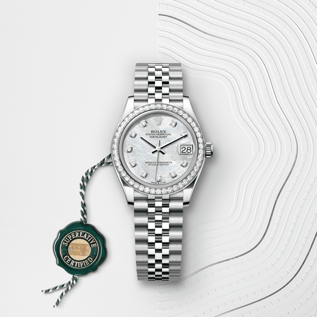 This dial features diamonds in 18 kt gold settings. Mother-of-pearl is by its nature full of mystery and surprises. Depending on its origin, it can be pink, white, black or yellow. It differs in colour, intensity and structure according to the part of the shell from which it is extracted. At Rolex, mother-of-pearl is never artificially coloured. Instead, particular know-how and skill are devoted to simply highlighting its natural beauty and preserving the original hues. As all mother-of-pearl dials are unique pieces, an identical dial will never be found on another wrist.