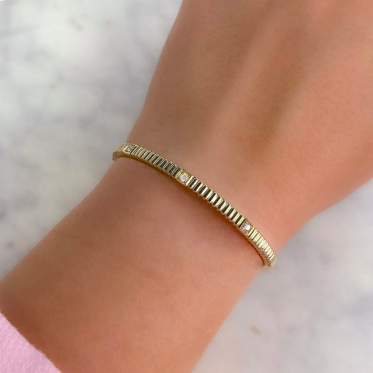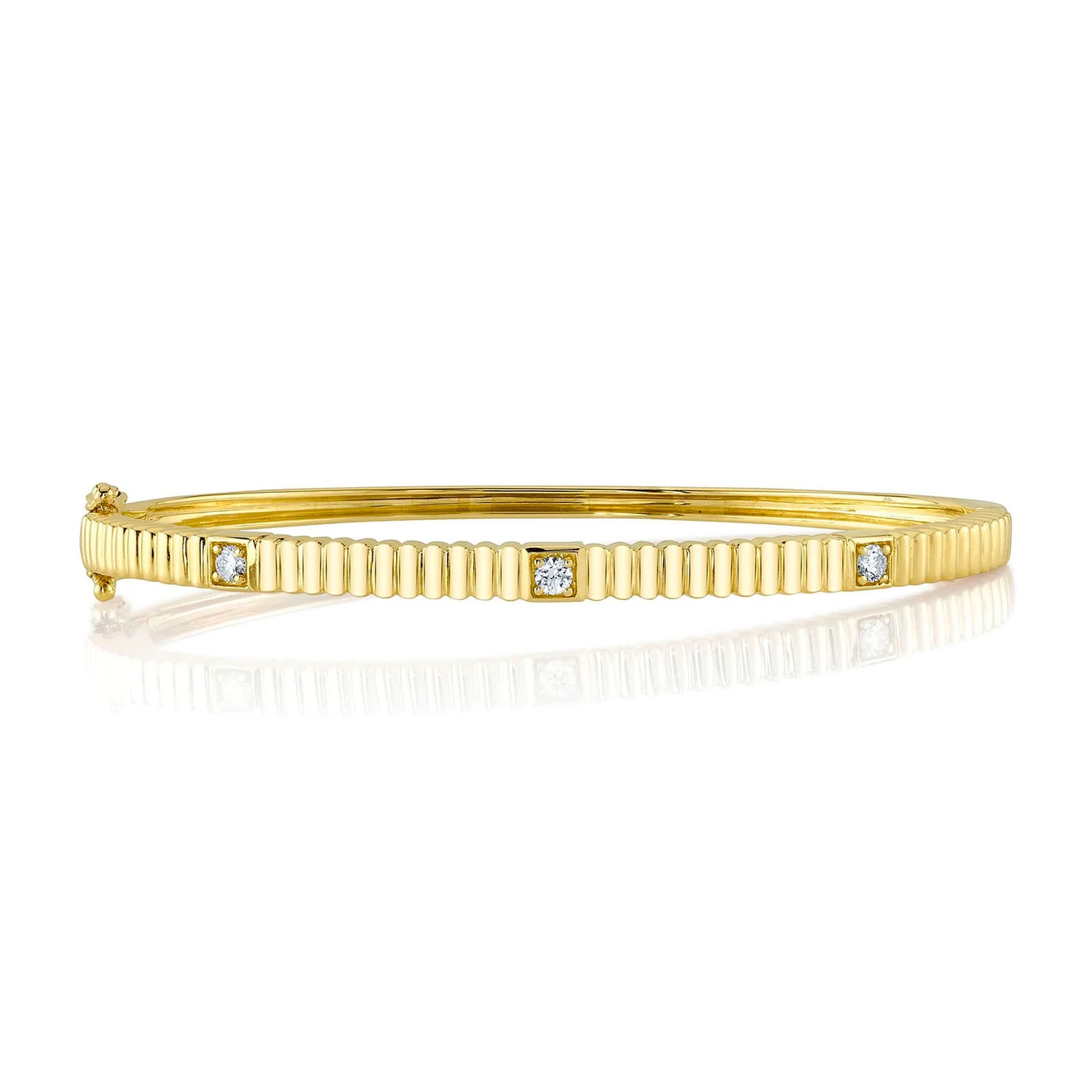 Crafted from 14k yellow gold, this lovely grooved bangle features three round brilliant diamond stations. Perfect for solo wear or a trendy stack.