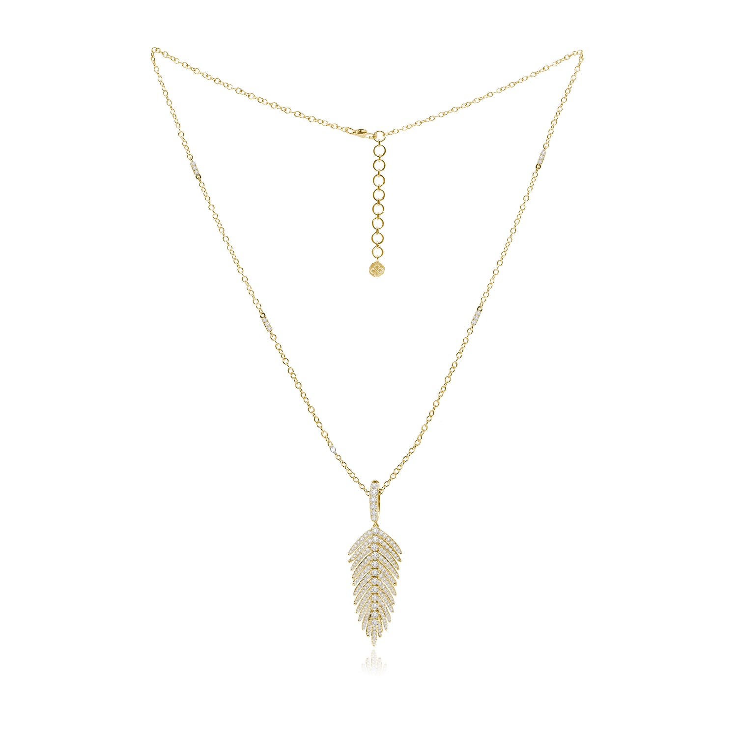 18k yellow gold 20" melee=1.18ct h si br diamond feather pendant on diamond station chain