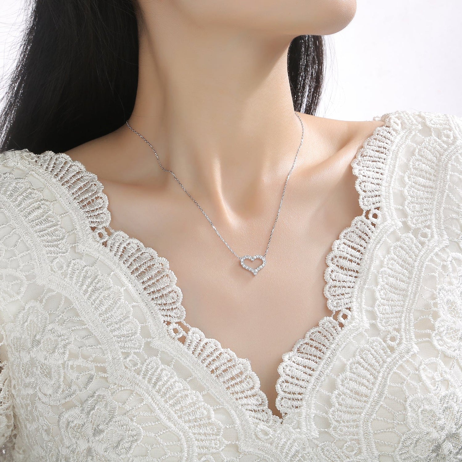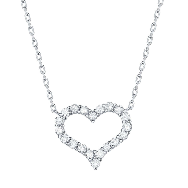 Crafted from 14k white gold, this open heart necklace is set with half a carat of lab grown round brilliant diamonds.