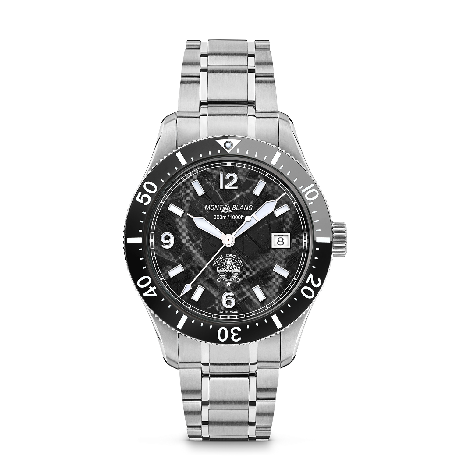 The first-ever sports diving watch for Montblanc, the Montblanc Iced Sea Automatic Date features a glacier pattern dial that gives the impression of looking into the depths of a glacier. This black glacial pattern dial is inspired by the Mer de Glace - Sea of Ice - the main glacier of the Mont-Blanc Massif. Its texture was achieved using an almost-forgotten ancestral technique called gratté-boisé. The timepiece is housed in a 41mm stainless steel case and comes with a unidirectional bi-colour ceramic bezel, an engraved case back, and a tapered interchangeable stainless steel bracelet with fine adjustment for precision fitting. The timepiece conforms to the ISO 6425 norm for diving watches and is water-resistant to 300 metres.