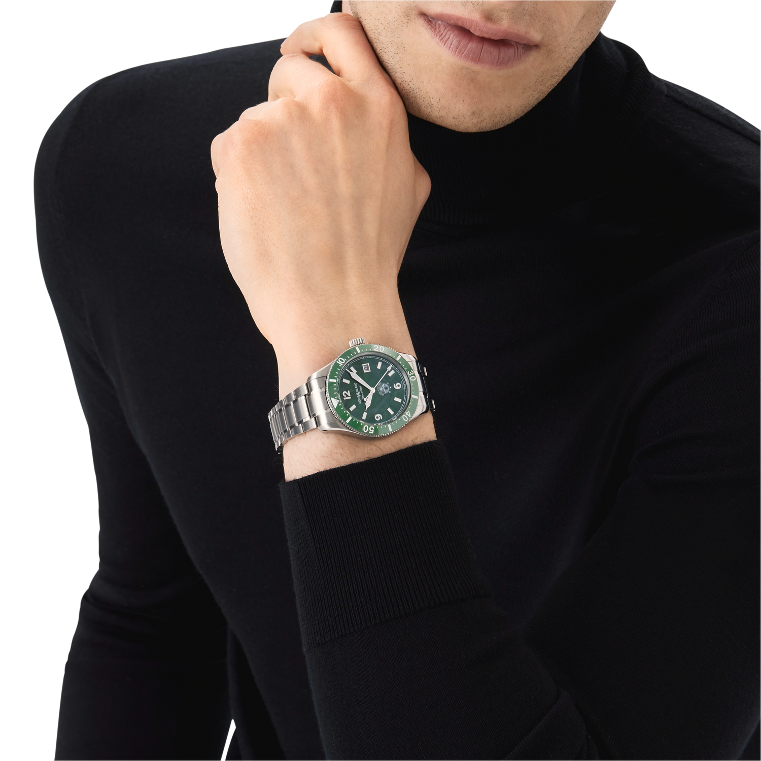 The first-ever sports diving watch for Montblanc, the Montblanc Iced Sea Automatic Date features a glacier pattern dial that gives the impression of looking into the depths of a glacier. This green glacial pattern dial is inspired by the Mer de Glace - Sea of Ice - the main glacier of the Mont-Blanc Massif. Its texture was achieved using an almost-forgotten ancestral technique called gratté-boisé. The timepiece is housed in a 41mm stainless steel case and comes with a unidirectional bi-colour ceramic bezel, an engraved case back, and an interchangeable stainless steel bracelet with fine adjustment system. The timepiece conforms to the ISO 6425 norm for diving watches and is water-resistant to 300 metres.