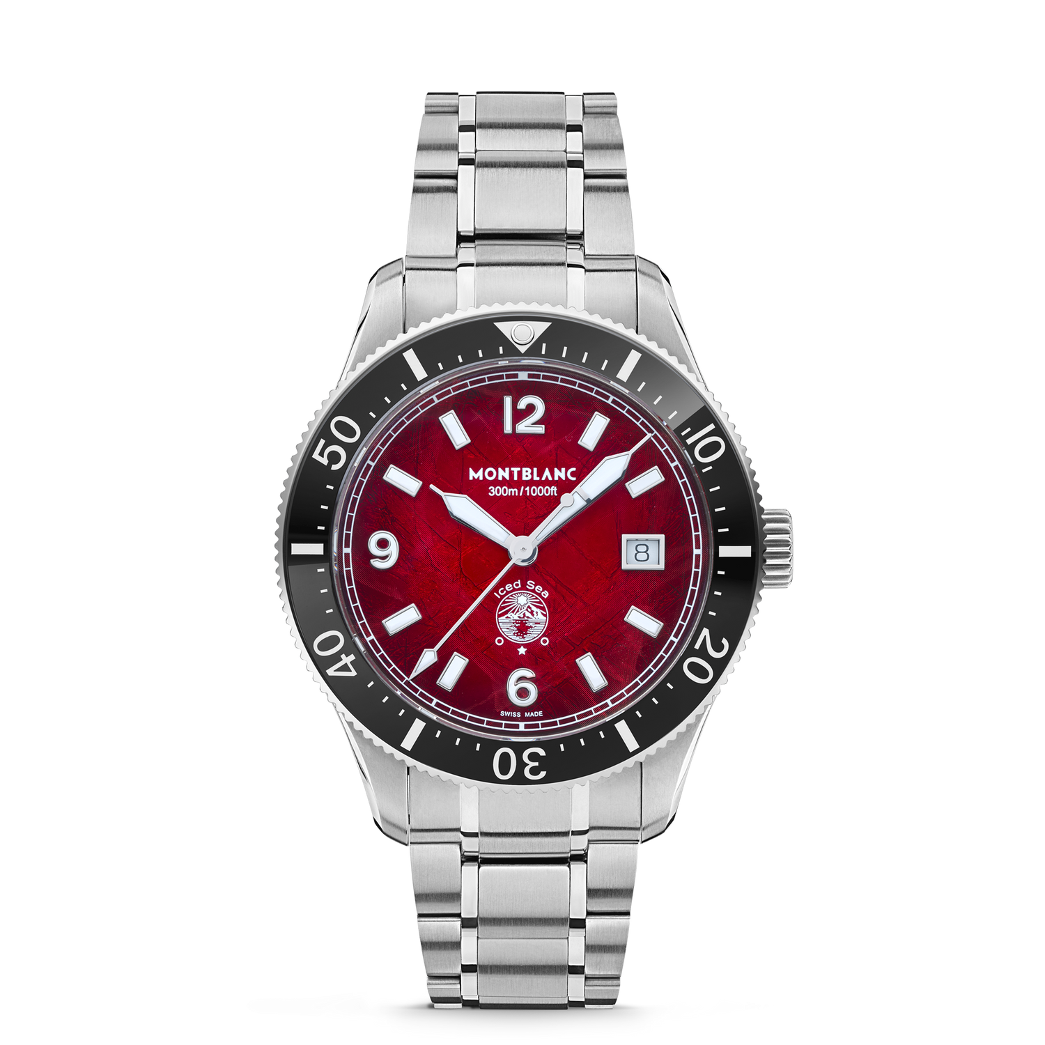 The Montblanc Iced Sea Automatic Date with burgundy-tone glacier pattern dial is reminiscent of the deep red colour of the evening sun as it hits the glacier. The glacier pattern dial is inspired by the Mer de Glace - Sea of Ice - the main glacier of the Mont-Blanc Massif. Its texture was achieved using an almost-forgotten ancestral technique called gratté-boisé. The timepiece comes with a black unidirectional ceramic bezel, a 3D engraving on the case back, and an interchangeable stainless steel bracelet with fine adjustment system. The timepiece conforms to the ISO 6425 norm for scuba diving and comes with a water resistance of 300 meters.