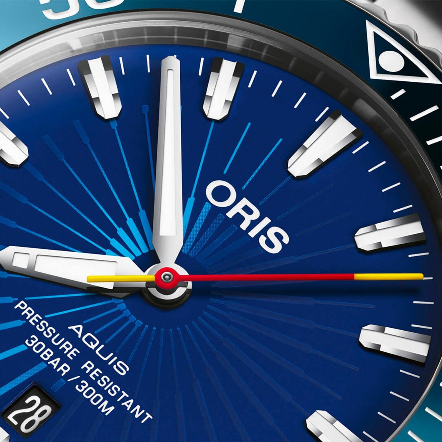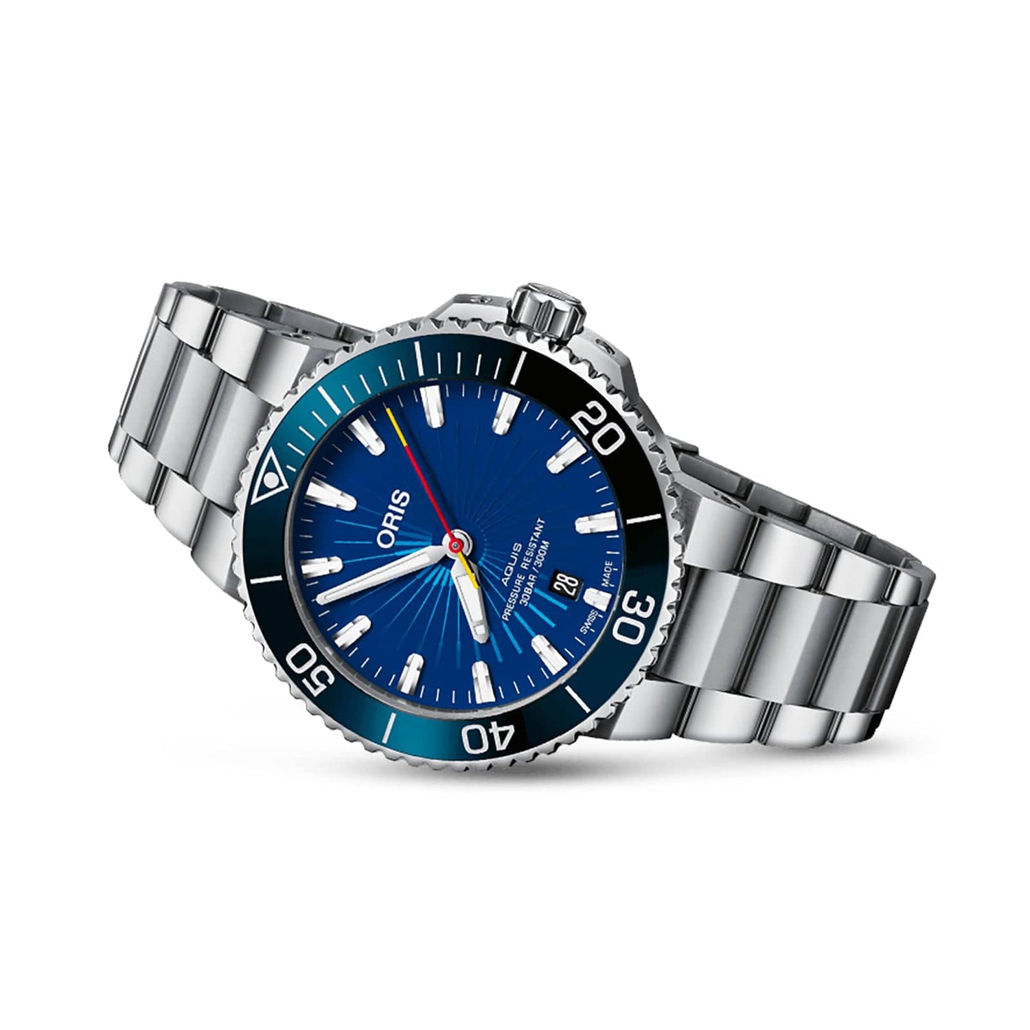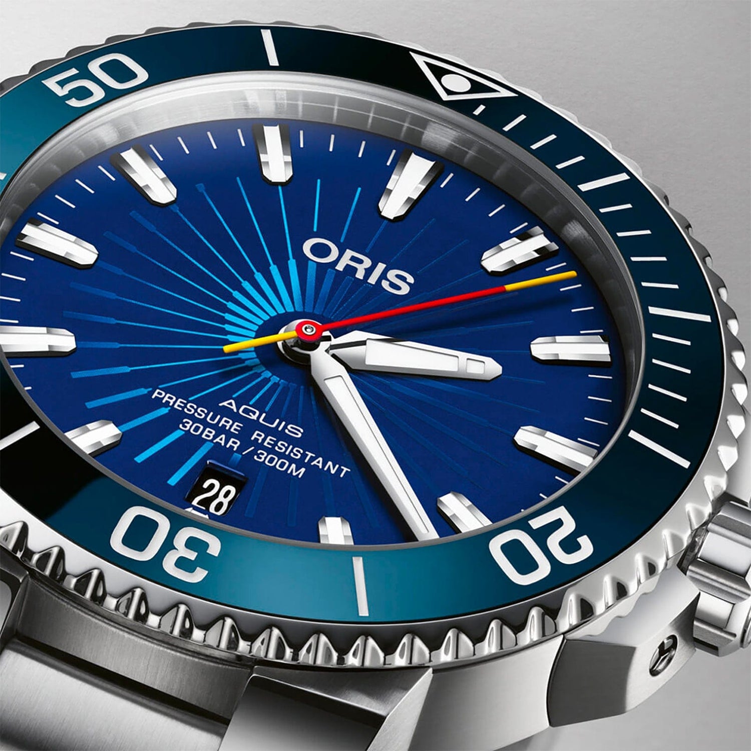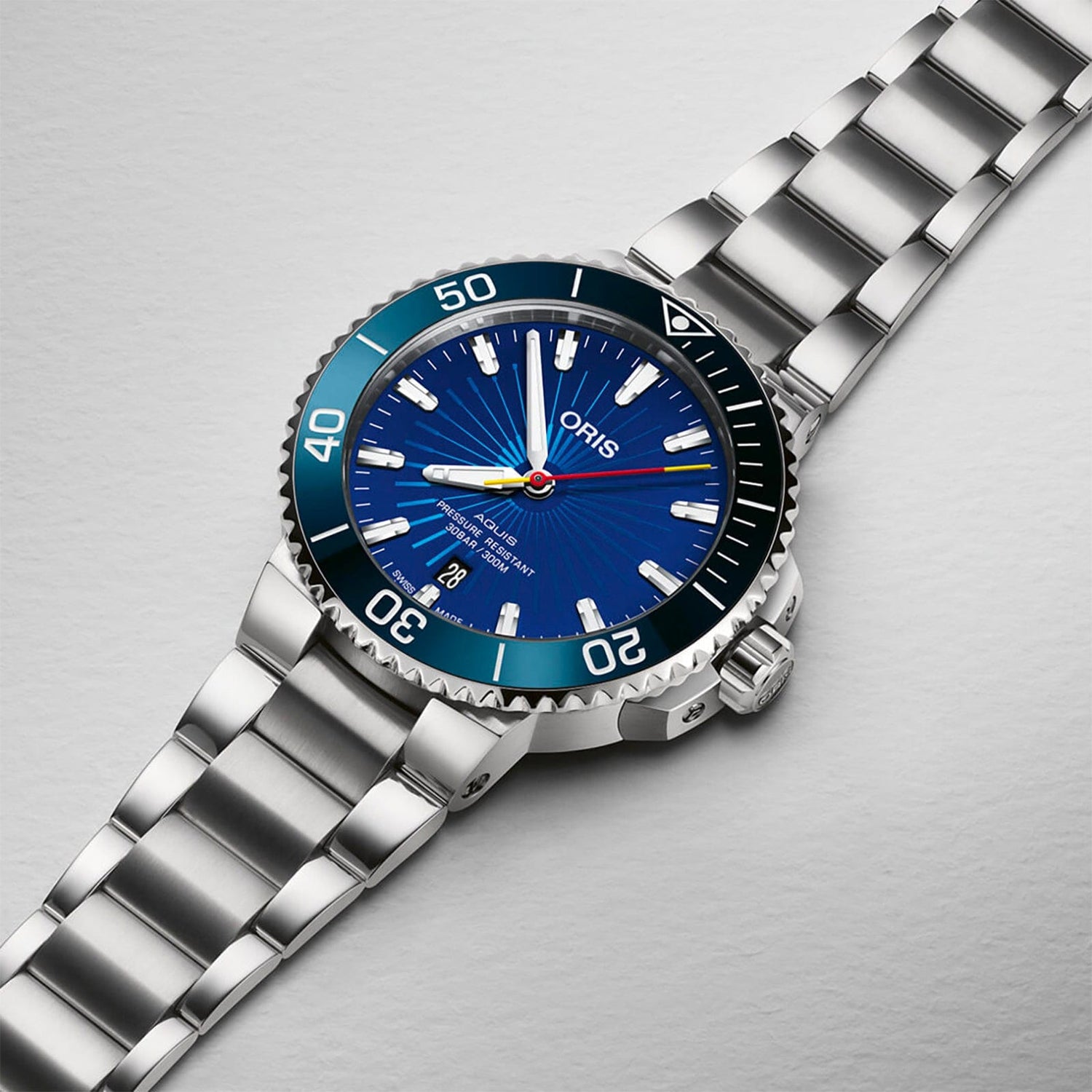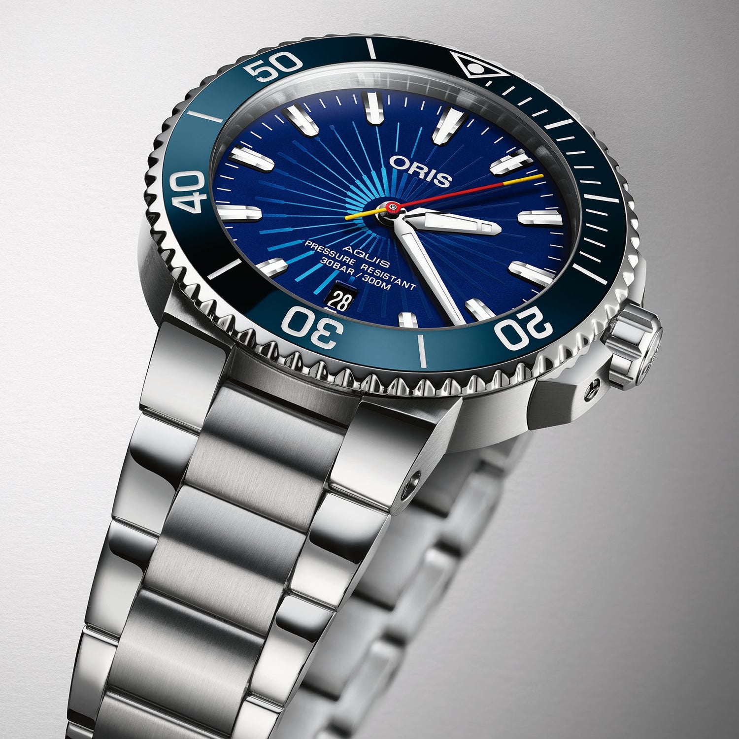 It has a 41.5 mm stainless steel case and a unidirectional rotating bezel that’s equipped with an ocean blue ceramic bezel that plays an appreciable role in delivering the watch’s singular character. Crown protectors, a screw-down crown and a stainless steel bracelet with an extendable folding clasp serve as a reminder of the watch’s impeccable underwater credentials – as the dial indicates, the watch is water-resistant to 30 bar (300 meters). Inside it is an automatic mechanical movement that provides the watch with its sweeping, “spinning” central seconds hand.