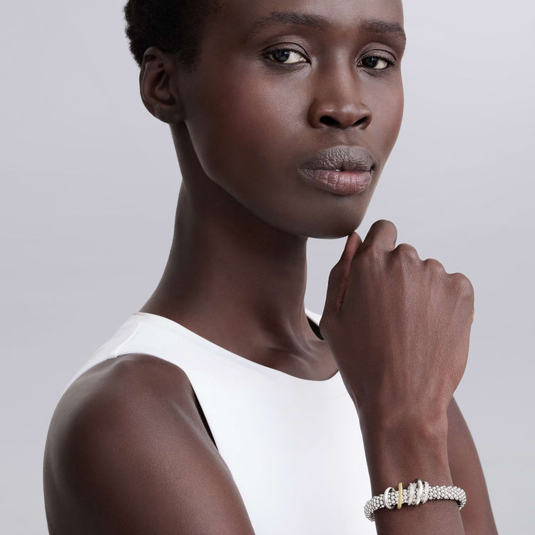 Smooth sterling silver, 18K gold superfine Caviar beading, and diamonds form five stationary rings on a classic sterling silver Caviar rope bracelet. LAGOS diamonds are the highest quality natural stones. Size Medium