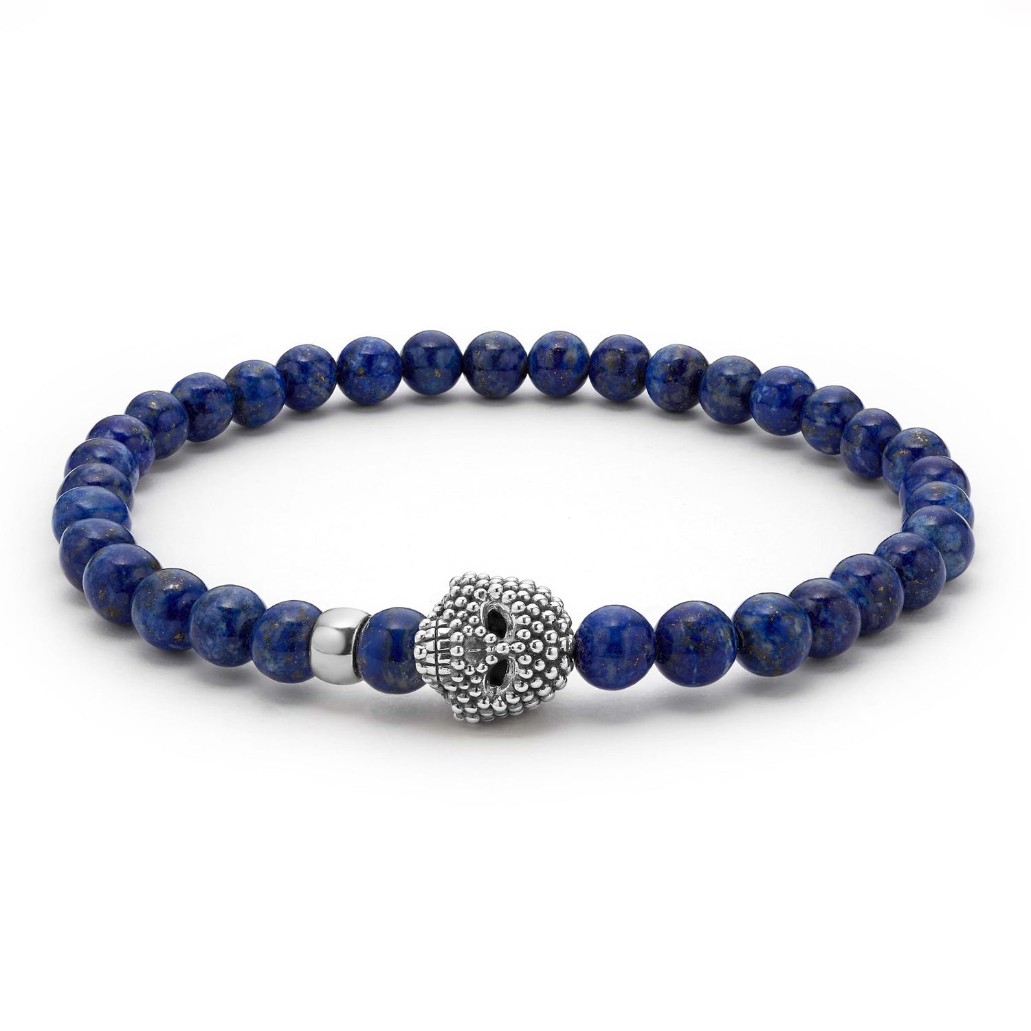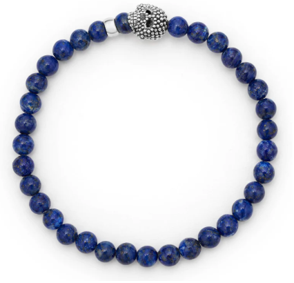 Lapis gemstones accented with a sterling silver Caviar beaded skull form this stretch bracelet.