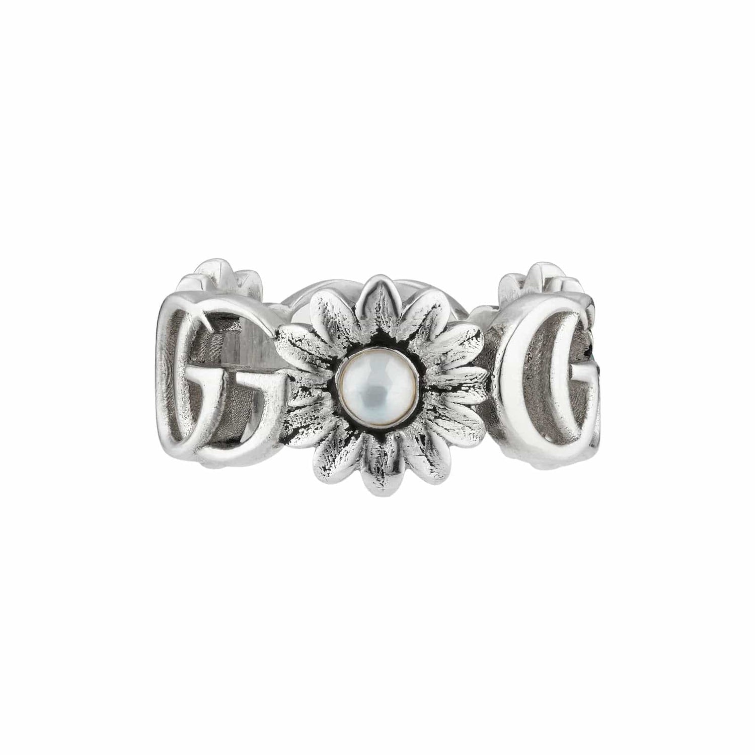 The natural beauty of the botanic world continues to act as a rich source of inspiration for Gucci's designs. Crafted from sterling silver, this ring brings together the Double G monogram with mother of pearl, blue topaz, and turquoise-colored resin cabochons set in delicate flower stations.