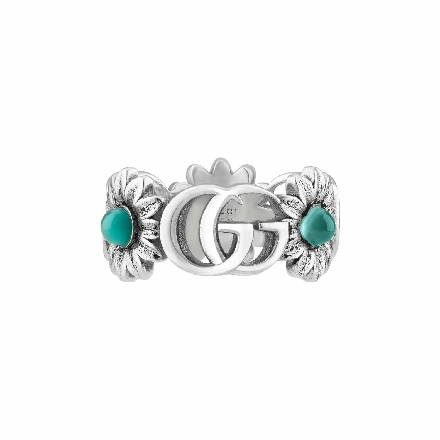 The natural beauty of the botanic world continues to act as a rich source of inspiration for Gucci's designs. Crafted from sterling silver, this ring brings together the Double G monogram with mother of pearl, blue topaz, and turquoise-colored resin cabochons set in delicate flower stations.