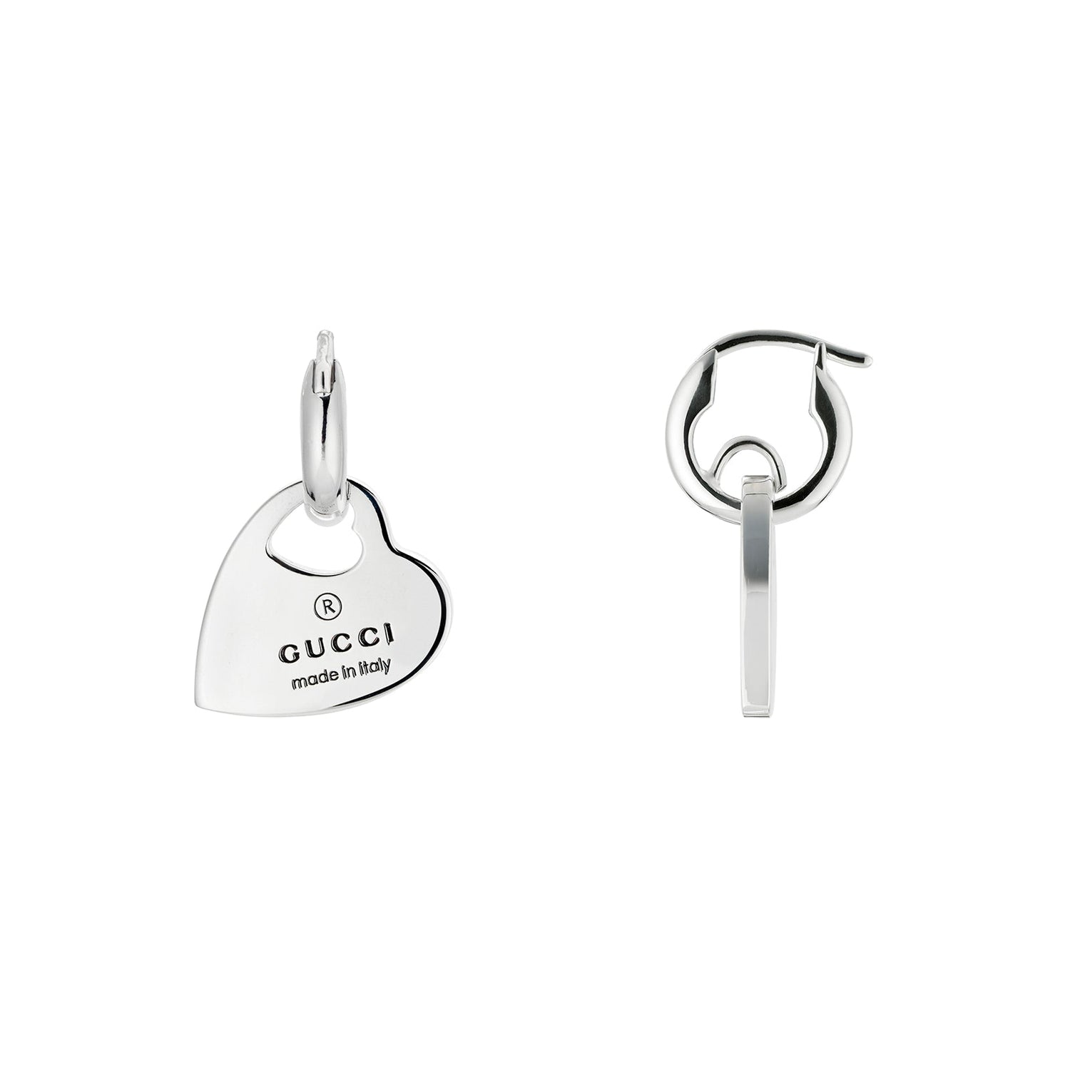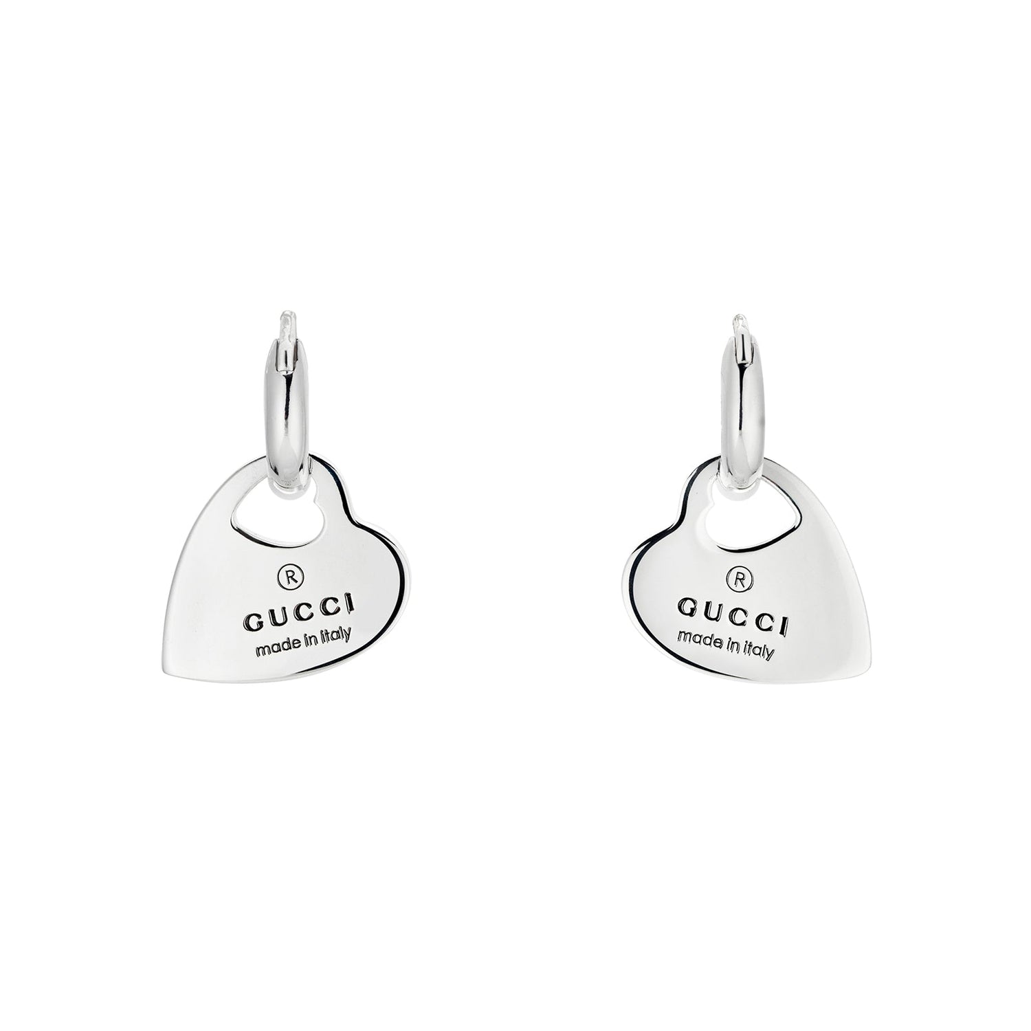 The Gucci Trademark line combines motifs and hexagonal charms with the name of the House. From the cut-out heart to the padlock charm, playful symbols continue to distinguish a selection of rings, necklaces, bracelets and earrings for Pre-Fall 2024. This pair of delicate hoop earrings feature a cut-out heart within the heart pendant.