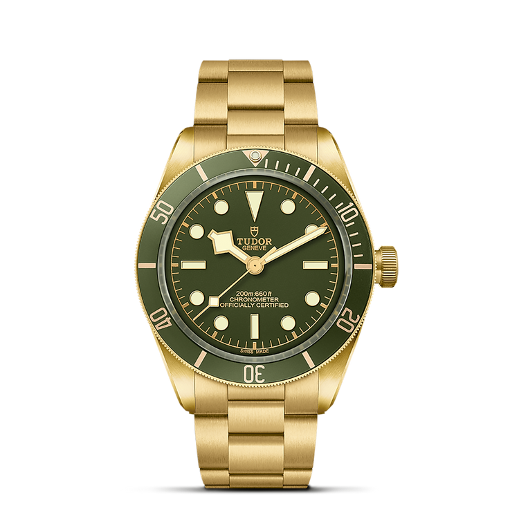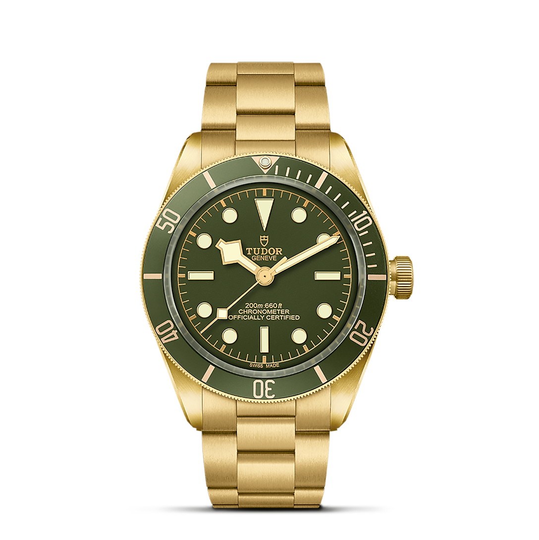 18 ct yellow gold screw-down winding crown, with the TUDOR rose in relief with circular satin-brushed 18 ct yellow gold winding crown tube