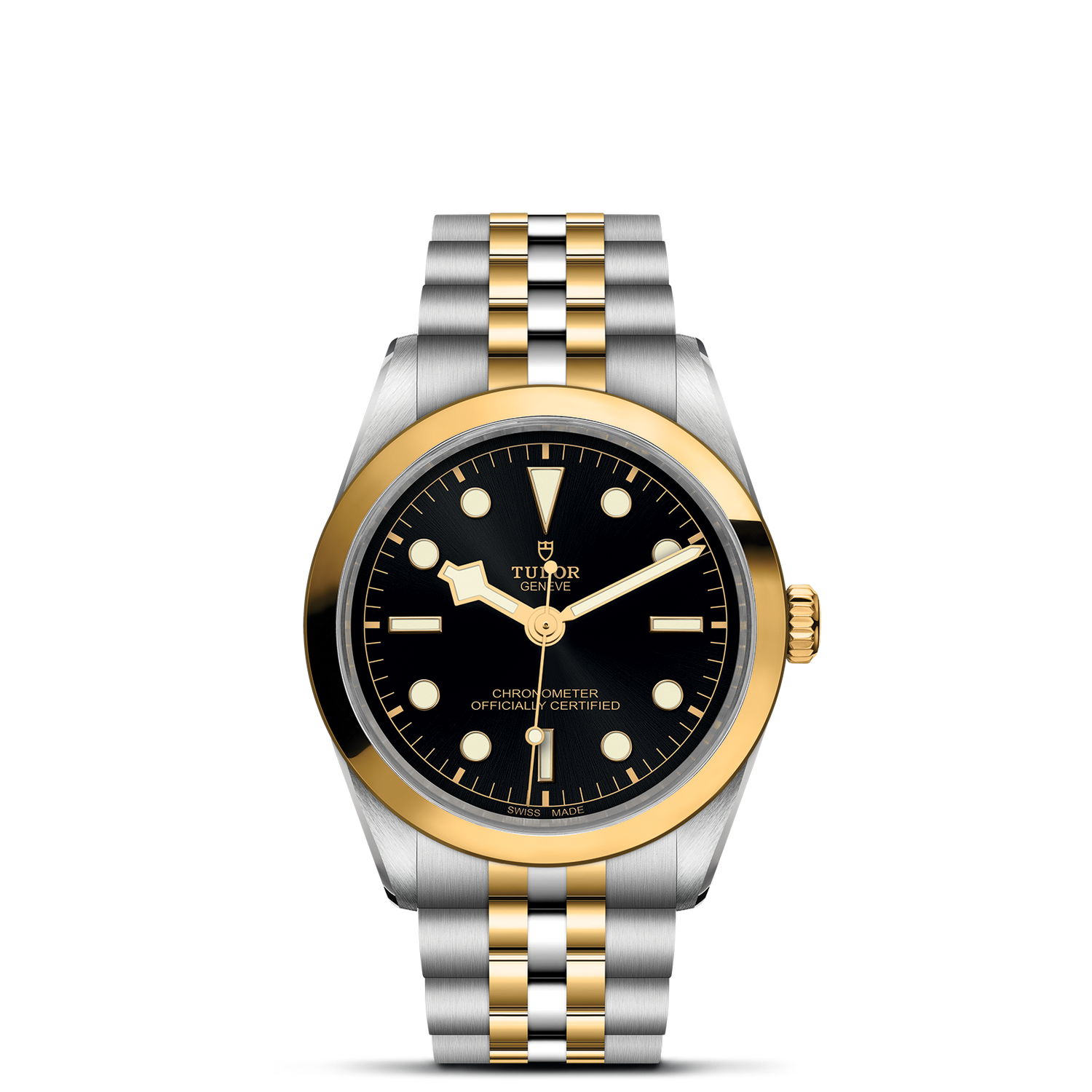 Yellow gold center links at 6 and 12 o’clock. Remaining center links in steel covered by a 0.2mm 18 ct yellow gold cap. "T-fit" folding clasp with safety catch. The logo on the catch is made of yellow gold