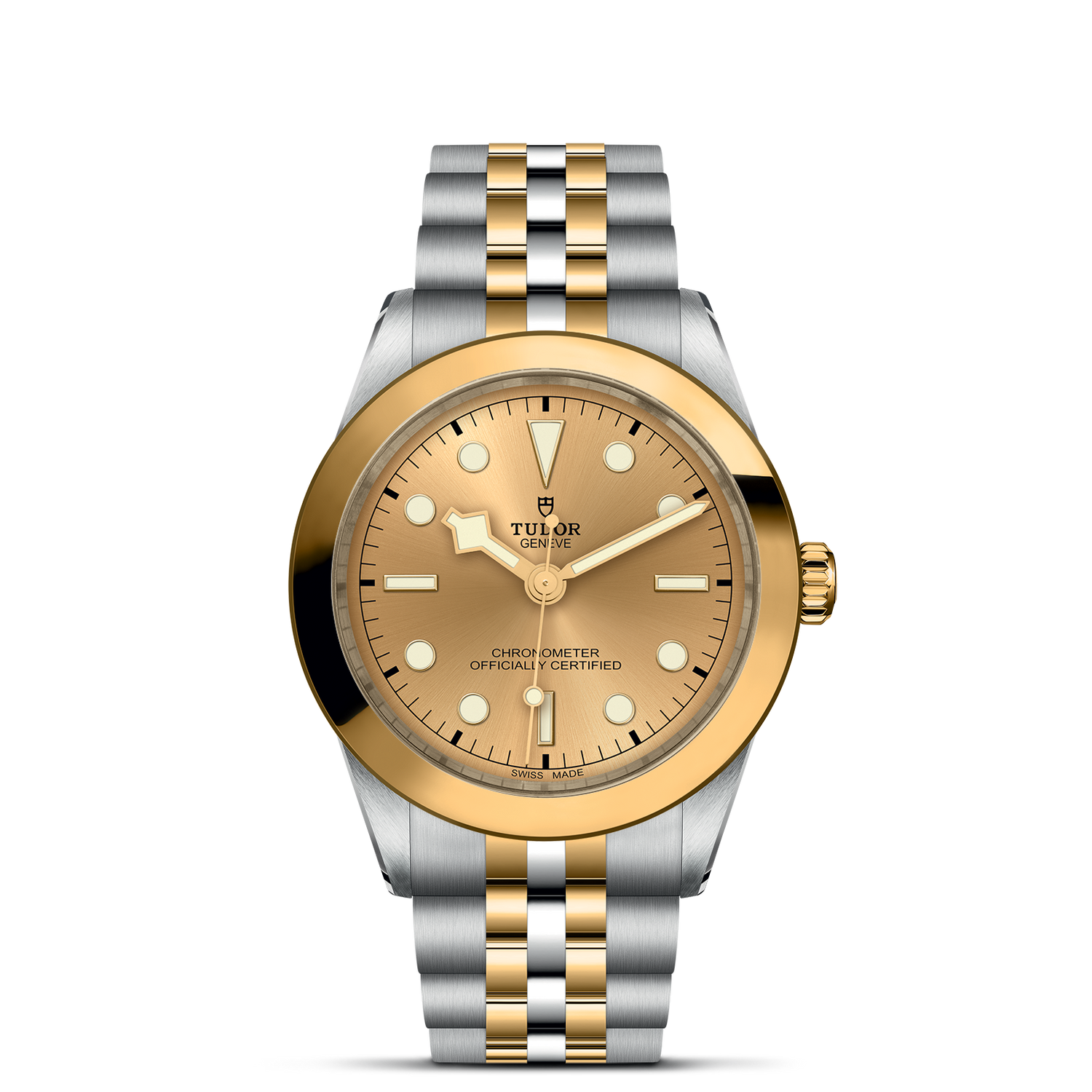 Screw-down winding crown with the TUDOR rose in relief. Steel covered by a 0.1mm 18 ct yellow gold cap