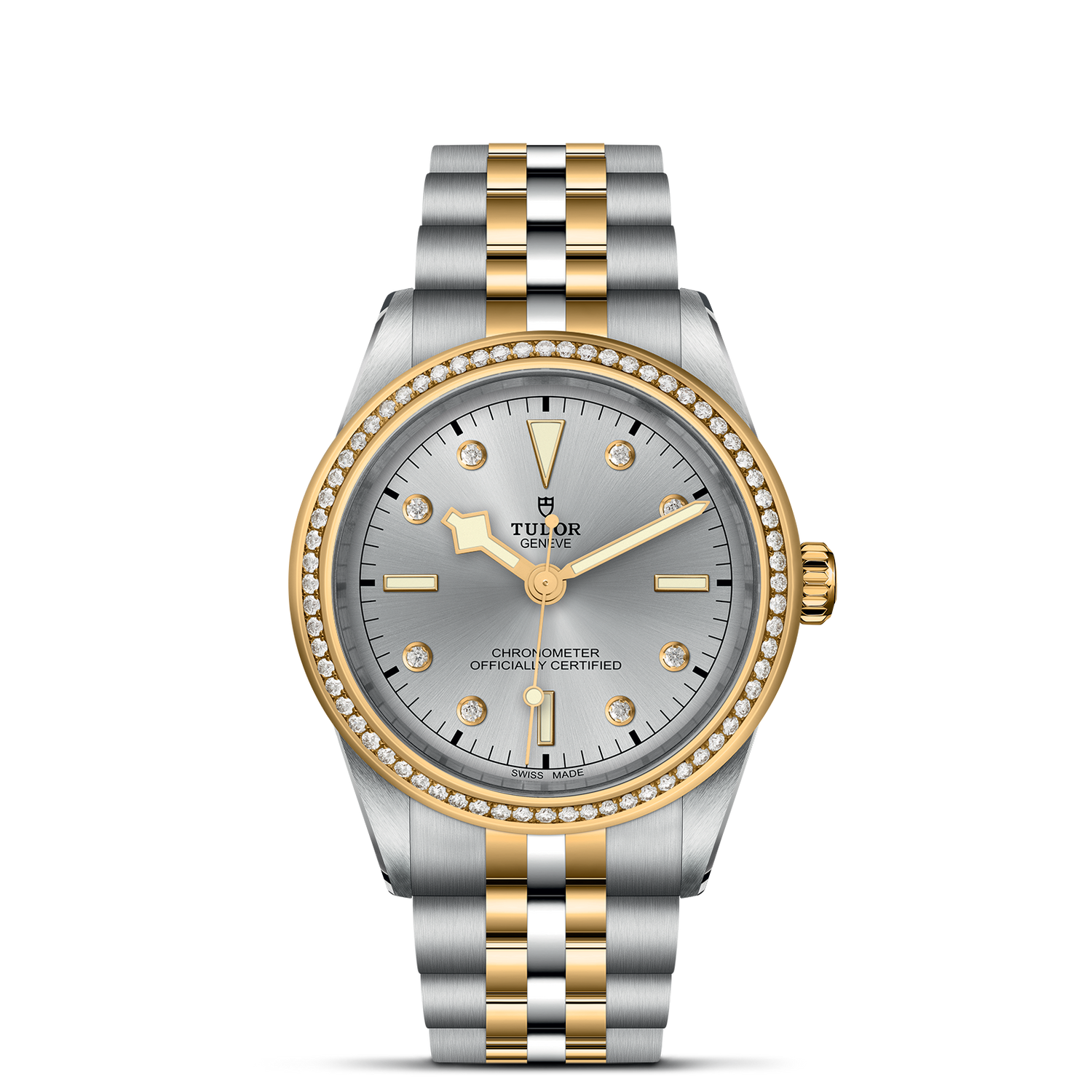 Yellow gold center links at 6 and 12 o’clock. Remaining center links in steel covered by a 0.2mm 18 ct yellow gold cap. "T-fit" folding clasp with safety catch. The logo on the catch is made of yellow gold
